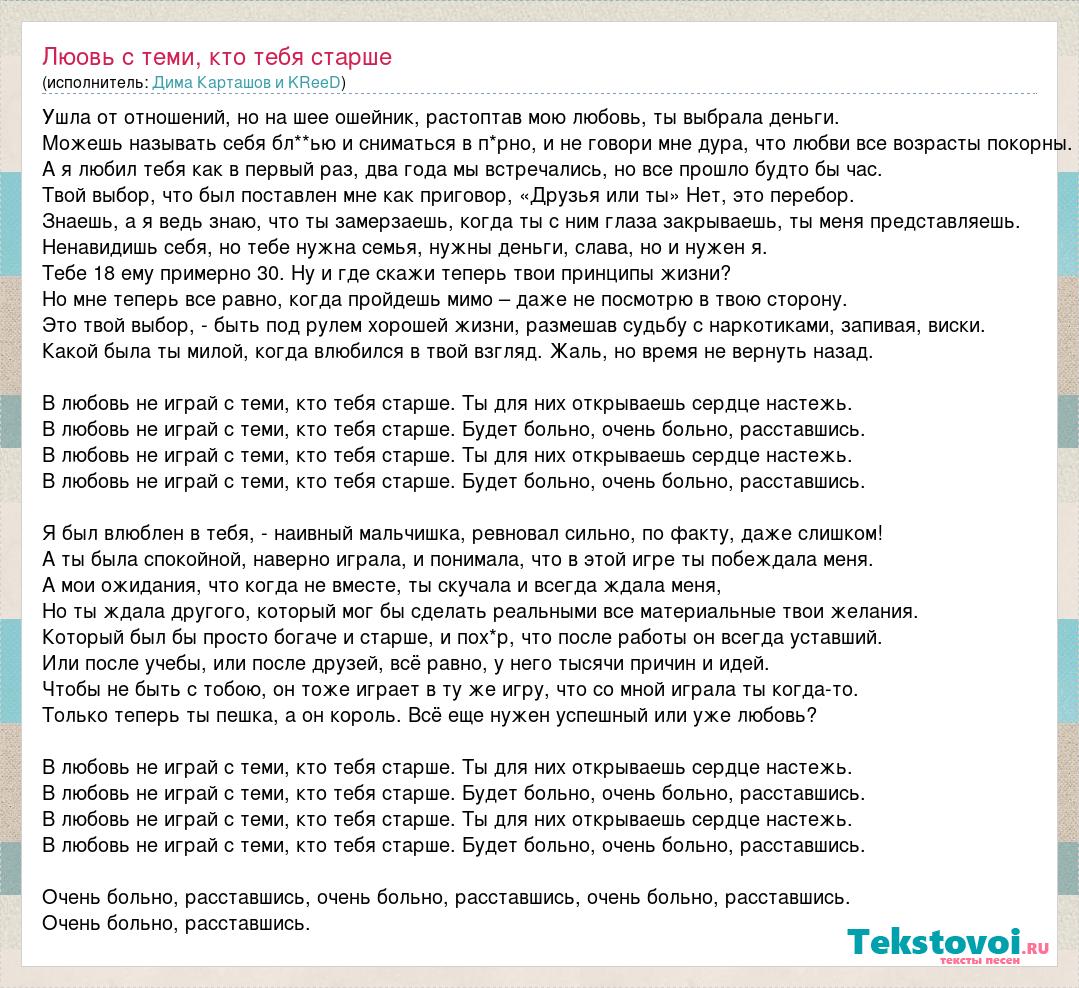 Ушла от отношений, но на шее ошейник, растоптав мою любовь, ты выбрала деньги. Можешь называть себя бл**ью и сниматься в п*рно, и не говори мне дура, что любви все возрасты покорны. А я любил тебя как в первый раз, два года мы встречались, но все прошло будто бы час. Твой выбор, что был поставлен мне как приговор, «Друзья или ты» Нет, это перебор. Знаешь, а я ведь знаю, что ты замерзаешь, когда ты с ним глаза закрываешь, ты меня представляешь. Ненавидишь себя, но тебе нужна семья, нужны деньги, слава, но и нужен я. Тебе 18 ему примерно 30. Ну и где скажи теперь твои принципы жизни? Но мне теперь все равно, когда пройдешь мимо – даже не посмотрю в твою сторону. Это твой выбор, - быть под рулем хорошей жизни, размешав судьбу с наркотиками, запивая, виски. Какой была ты милой, когда влюбился в твой взгляд. Жаль, но время не вернуть назад. В любовь не играй с теми, кто тебя старше. Ты для них открываешь сердце настежь. В любовь не играй с теми, кто тебя старше. Будет больно, очень больно, расставшись. В любовь не играй с теми, кто тебя старше. Ты для них открываешь сердце настежь. В любовь не играй с теми, кто тебя старше. Будет больно, очень больно, расставшись. Я был влюблен в тебя, - наивный мальчишка, ревновал сильно, по факту, даже слишком! А ты была спокойной, наверно играла, и понимала, что в этой игре ты побеждала меня. А мои ожидания, что когда не вместе, ты скучала и всегда ждала меня, Но ты ждала другого, который мог бы сделать реальными все материальные твои желания. Который был бы просто богаче и старше, и пох*р, что после работы он всегда уставший. Или после учебы, или после друзей, всё равно, у него тысячи причин и идей. Чтобы не быть с тобою, он тоже играет в ту же игру, что со мной играла ты когда-то. Только теперь ты пешка, а он король. Всё еще нужен успешный или уже любовь? В любовь не играй с теми, кто тебя старше. Ты для них открываешь сердце настежь. В любовь не играй с теми, кто тебя старше. Будет больно, очень больно, расставшись. В любовь не играй с теми, кто тебя старше. Ты для них открываешь сердце настежь. В любовь не играй с теми, кто тебя старше. Будет больно, очень больно, расставшись. Очень больно, расставшись, очень больно, расставшись, очень больно, расставшись. Очень больно, расставшись.