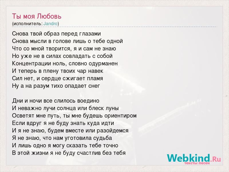 Снова твой образ перед глазами Снова мысли в голове лишь о тебе одной Что со мной творится, я и сам не знаю Но уже не в силах совладать с собой Концентрации ноль, словно одурманен И теперь в плену твоих чар навек Сил нет, и сердце сжигает пламя Ну а на разум тихо опадает снег Дни и ночи все слилось воедино И неважно лучи солнца или блеск луны Осветят мне путь, ты мне будешь ориентиром Если вдруг я не буду знать куда идти И я не знаю, будем вместе или разойдемся Я не знаю, что нам уготовила судьба И лишь одно я могу сказать тебе точно В этой жизни я не буду счастлив без тебя