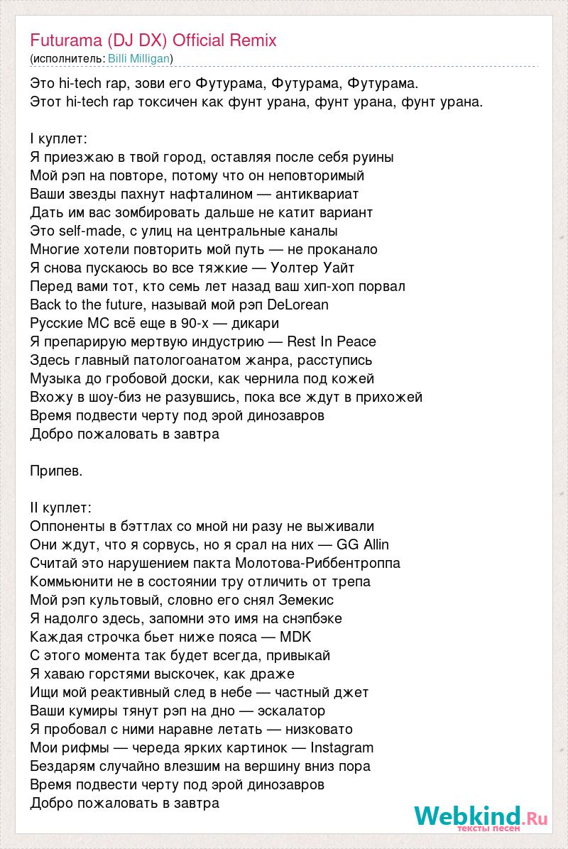 Это hi-tech rap, зови его Футурама, Футурама, Футурама. Этот hi-tech rap токсичен как фунт урана, фунт урана, фунт урана. I куплет: Я приезжаю в твой город, оставляя после себя руины Мой рэп на повторе, потому что он неповторимый Ваши звезды пахнут нафталином — антиквариат Дать им вас зомбировать дальше не катит вариант Это self-made, с улиц на центральные каналы Многие хотели повторить мой путь — не проканало Я снова пускаюсь во все тяжкие — Уолтер Уайт Перед вами тот, кто семь лет назад ваш хип-хоп порвал Back to the future, называй мой рэп DeLorean Русские MC всё еще в 90-х — дикари Я препарирую мертвую индустрию — Rest In Peace Здесь главный патологоанатом жанра, расступись Музыка до гробовой доски, как чернила под кожей Вхожу в шоу-биз не разувшись, пока все ждут в прихожей Время подвести черту под эрой динозавров Добро пожаловать в завтра Припев. II куплет: Оппоненты в бэттлах со мной ни разу не выживали Они ждут, что я сорвусь, но я срал на них — GG Allin Считай это нарушением пакта Молотова-Риббентроппа Коммьюнити не в состоянии тру отличить от трепа Мой рэп культовый, словно его снял Земекис Я надолго здесь, запомни это имя на снэпбэке Каждая строчка бьет ниже пояса — MDK С этого момента так будет всегда, привыкай Я хаваю горстями выскочек, как драже Ищи мой реактивный след в небе — частный джет Ваши кумиры тянут рэп на дно — эскалатор Я пробовал с ними наравне летать — низковато Мои рифмы — череда ярких картинок — Instagram Бездарям случайно влезшим на вершину вниз пора Время подвести черту под эрой динозавров Добро пожаловать в завтра