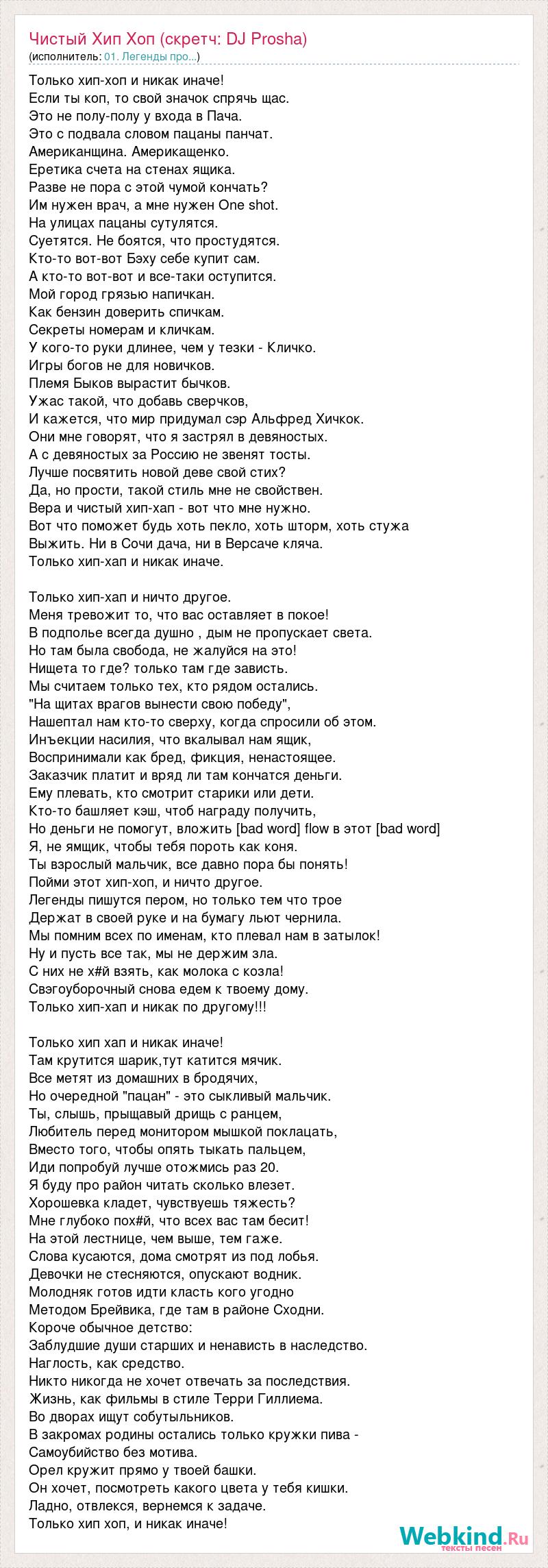 Только хип-хоп и никак иначе! Если ты коп, то свой значок спрячь щас. Это не полу-полу у входа в Пача. Это с подвала словом пацаны панчат. Американщина. Америкащенко. Еретика счета на стенах ящика. Разве не пора с этой чумой кончать? Им нужен врач, а мне нужен One shot. На улицах пацаны сутулятся. Суетятся. Не боятся, что простудятся. Кто-то вот-вот Бэху себе купит сам. А кто-то вот-вот и все-таки оступится. Мой город грязью напичкан. Как бензин доверить спичкам. Секреты номерам и кличкам. У кого-то руки длинее, чем у тезки - Кличко. Игры богов не для новичков. Племя Быков вырастит бычков. Ужас такой, что добавь сверчков, И кажется, что мир придумал сэр Альфред Хичкок. Они мне говорят, что я застрял в девяностых. А с девяностых за Россию не звенят тосты. Лучше посвятить новой деве свой стих? Да, но прости, такой стиль мне не свойствен. Вера и чистый хип-хап - вот что мне нужно. Вот что поможет будь хоть пекло, хоть шторм, хоть стужа Выжить. Ни в Сочи дача, ни в Версаче кляча. Только хип-хап и никак иначе. Только хип-хап и ничто другое. Меня тревожит то, что вас оставляет в покое! В подполье всегда душно , дым не пропускает света. Но там была свобода, не жалуйся на это! Нищета то где? только там где зависть. Мы считаем только тех, кто рядом остались. "На щитах врагов вынести свою победу", Нашептал нам кто-то сверху, когда спросили об этом. Инъекции насилия, что вкалывал нам ящик, Воспринимали как бред, фикция, ненастоящее. Заказчик платит и вряд ли там кончатся деньги. Ему плевать, кто смотрит старики или дети. Кто-то башляет кэш, чтоб награду получить, Но деньги не помогут, вложить [bad word] flow в этот [bad word] Я, не ямщик, чтобы тебя пороть как коня. Ты взрослый мальчик, все давно пора бы понять! Пойми этот хип-хоп, и ничто другое. Легенды пишутся пером, но только тем что трое Держат в своей руке и на бумагу льют чернила. Мы помним всех по именам, кто плевал нам в затылок! Ну и пусть все так, мы не держим зла. С них не х#й взять, как молока с козла! Свэгоуборочный снова едем к твоему дому. Только хип-хап и никак по другому!!! Только хип хап и никак иначе! Там крутится шарик,тут катится мячик. Все метят из домашних в бродячих, Но очередной "пацан" - это сыкливый мальчик. Ты, слышь, прыщавый дрищь с ранцем, Любитель перед монитором мышкой поклацать, Вместо того, чтобы опять тыкать пальцем, Иди попробуй лучше отожмись раз 20. Я буду про район читать сколько влезет. Хорошевка кладет, чувствуешь тяжесть? Мне глубоко пох#й, что всех вас там бесит! На этой лестнице, чем выше, тем гаже. Слова кусаются, дома смотрят из под лобья. Девочки не стесняются, опускают водник. Молодняк готов идти класть кого угодно Методом Брейвика, где там в районе Сходни. Короче обычное детство: Заблудшие души старших и ненависть в наследство. Наглость, как средство. Никто никогда не хочет отвечать за последствия. Жизнь, как фильмы в стиле Терри Гиллиема. Во дворах ищут собутыльников. В закромах родины остались только кружки пива - Самоубийство без мотива. Орел кружит прямо у твоей башки. Он хочет, посмотреть какого цвета у тебя кишки. Ладно, отвлекся, вернемся к задаче. Только хип хоп, и никак иначе!