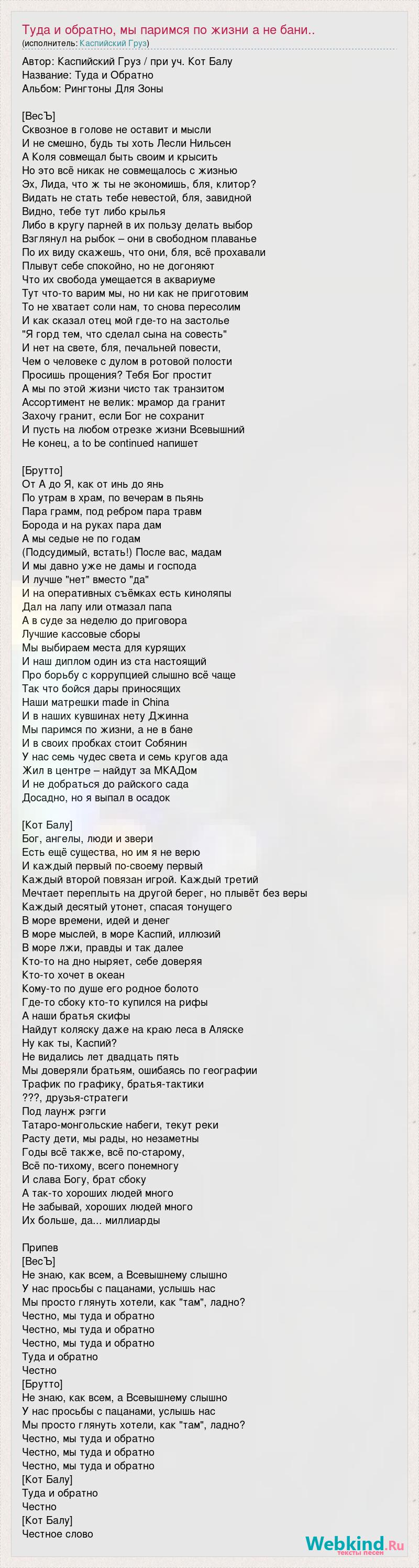 Автор: Каспийский Груз / при уч. Кот Балу Название: Туда и Обратно Альбом: Рингтоны Для Зоны [ВесЪ] Сквозное в голове не оставит и мысли И не смешно, будь ты хоть Лесли Нильсен А Коля совмещал быть своим и крысить Но это всё никак не совмещалось с жизнью Эх, Лида, что ж ты не экономишь, бля, клитор? Видать не стать тебе невестой, бля, завидной Видно, тебе тут либо крылья Либо в кругу парней в их пользу делать выбор Взглянул на рыбок – они в свободном плаванье По их виду скажешь, что они, бля, всё прохавали Плывут себе спокойно, но не догоняют Что их свобода умещается в аквариуме Тут что-то варим мы, но ни как не приготовим То не хватает соли нам, то снова пересолим И как сказал отец мой где-то на застолье "Я горд тем, что сделал сына на совесть" И нет на свете, бля, печальней повести, Чем о человеке с дулом в ротовой полости Просишь прощения? Тебя Бог простит А мы по этой жизни чисто так транзитом Ассортимент не велик: мрамор да гранит Захочу гранит, если Бог не сохранит И пусть на любом отрезке жизни Всевышний Не конец, а to be continued напишет [Брутто] От А до Я, как от инь до янь По утрам в храм, по вечерам в пьянь Пара грамм, под ребром пара травм Борода и на руках пара дам А мы седые не по годам (Подсудимый, встать!) После вас, мадам И мы давно уже не дамы и господа И лучше "нет" вместо "да" И на оперативных съёмках есть киноляпы Дал на лапу или отмазал папа А в суде за неделю до приговора Лучшие кассовые сборы Мы выбираем места для курящих И наш диплом один из ста настоящий Про борьбу с коррупцией слышно всё чаще Так что бойся дары приносящих Наши матрешки made in China И в наших кувшинах нету Джинна Мы паримся по жизни, а не в бане И в своих пробках стоит Собянин У нас семь чудес света и семь кругов ада Жил в центре – найдут за МКАДом И не добраться до райского сада Досадно, но я выпал в осадок [Кот Балу] Бог, ангелы, люди и звери Есть ещё существа, но им я не верю И каждый первый по-своему первый Каждый второй повязан игрой. Каждый третий Мечтает переплыть на другой берег, но плывёт без веры Каждый десятый утонет, спасая тонущего В море времени, идей и денег В море мыслей, в море Каспий, иллюзий В море лжи, правды и так далее Кто-то на дно ныряет, себе доверяя Кто-то хочет в океан Кому-то по душе его родное болото Где-то сбоку кто-то купился на рифы А наши братья скифы Найдут коляску даже на краю леса в Аляске Ну как ты, Каспий? Не видались лет двадцать пять Мы доверяли братьям, ошибаясь по географии Трафик по графику, братья-тактики ???, друзья-стратеги Под лаунж рэгги Татаро-монгольские набеги, текут реки Расту дети, мы рады, но незаметны Годы всё также, всё по-старому, Всё по-тихому, всего понемногу И слава Богу, брат сбоку А так-то хороших людей много Не забывай, хороших людей много Их больше, да... миллиарды Припев [ВесЪ] Не знаю, как всем, а Всевышнему слышно У нас просьбы с пацанами, услышь нас Мы просто глянуть хотели, как "там", ладно? Честно, мы туда и обратно Честно, мы туда и обратно Честно, мы туда и обратно Туда и обратно Честно [Брутто] Не знаю, как всем, а Всевышнему слышно У нас просьбы с пацанами, услышь нас Мы просто глянуть хотели, как "там", ладно? Честно, мы туда и обратно Честно, мы туда и обратно Честно, мы туда и обратно [Кот Балу] Туда и обратно Честно [Кот Балу] Честное слово
