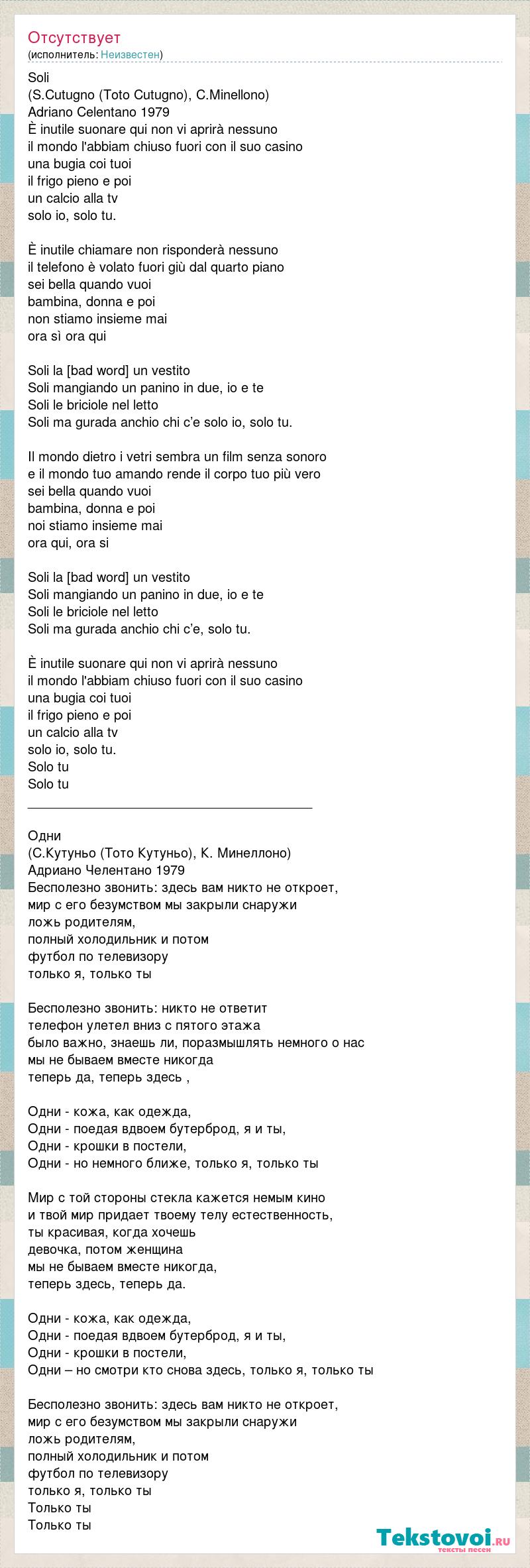 Soli (S.Cutugno (Toto Cutugno), C.Minellono) Adriano Celentano 1979 È inutile suonare qui non vi aprirà nessuno il mondo l'abbiam chiuso fuori con il suo casino una bugia coi tuoi il frigo pieno e poi un calcio alla tv solo io, solo tu. È inutile chiamare non risponderà nessuno il telefono è volato fuori giù dal quarto piano sei bella quando vuoi bambina, donna e poi non stiamo insieme mai ora sì ora qui Soli la pelle come un vestito Soli mangiando un panino in due, io e te Soli le briciole nel letto Soli ma gurada anchio chi c’e solo io, solo tu. Il mondo dietro i vetri sembra un film senza sonoro e il mondo tuo amando rende il corpo tuo più vero sei bella quando vuoi bambina, donna e poi noi stiamo insieme mai ora qui, ora si Soli la pelle come un vestito Soli mangiando un panino in due, io e te Soli le briciole nel letto Soli ma gurada anchio chi c’e, solo tu. È inutile suonare qui non vi aprirà nessuno il mondo l'abbiam chiuso fuori con il suo casino una bugia coi tuoi il frigo pieno e poi un calcio alla tv solo io, solo tu. Solo tu Solo tu _______________________________________ Одни (С.Кутуньо (Тото Кутуньо), К. Минеллоно) Адриано Челентано 1979 Бесполезно звонить: здесь вам никто не откроет, мир с его безумством мы закрыли снаружи ложь родителям, полный холодильник и потом футбол по телевизору только я, только ты Бесполезно звонить: никто не ответит телефон улетел вниз с пятого этажа было важно, знаешь ли, поразмышлять немного о нас мы не бываем вместе никогда теперь да, теперь здесь , Одни - кожа, как одежда, Одни - поедая вдвоем бутерброд, я и ты, Одни - крошки в постели, Одни - но немного ближе, только я, только ты Мир с той стороны стекла кажется немым кино и твой мир придает твоему телу естественность, ты красивая, когда хочешь девочка, потом женщина мы не бываем вместе никогда, теперь здесь, теперь да. Одни - кожа, как одежда, Одни - поедая вдвоем бутерброд, я и ты, Одни - крошки в постели, Одни – но смотри кто снова здесь, только я, только ты Бесполезно звонить: здесь вам никто не откроет, мир с его безумством мы закрыли снаружи ложь родителям, полный холодильник и потом футбол по телевизору только я, только ты Только ты Только ты