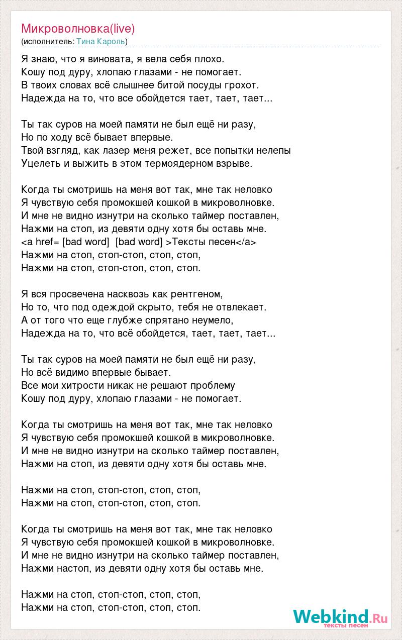 Я знаю, что я виновата, я вела себя плохо. Кошу под дуру, хлопаю глазами - не помогает. В твоих словах всё слышнее битой посуды грохот. Надежда на то, что все обойдется тает, тает, тает... Ты так суров на моей памяти не был ещё ни разу, Но по ходу всё бывает впервые. Твой взгляд, как лазер меня режет, все попытки нелепы Уцелеть и выжить в этом термоядерном взрыве. Когда ты смотришь на меня вот так, мне так неловко Я чувствую себя промокшей кошкой в микроволновке. И мне не видно изнутри на сколько таймер поставлен, Нажми на стоп, из девяти одну хотя бы оставь мне. <a href= [bad word] [bad word] >Тексты песен</a> Нажми на стоп, стоп-стоп, стоп, стоп, Нажми на стоп, стоп-стоп, стоп, стоп. Я вся просвечена насквозь как рентгеном, Но то, что под одеждой скрыто, тебя не отвлекает. А от того что еще глубже спрятано неумело, Надежда на то, что всё обойдется, тает, тает, тает... Ты так суров на моей памяти не был ещё ни разу, Но всё видимо впервые бывает. Все мои хитрости никак не решают проблему Кошу под дуру, хлопаю глазами - не помогает. Когда ты смотришь на меня вот так, мне так неловко Я чувствую себя промокшей кошкой в микроволновке. И мне не видно изнутри на сколько таймер поставлен, Нажми на стоп, из девяти одну хотя бы оставь мне. Нажми на стоп, стоп-стоп, стоп, стоп, Нажми на стоп, стоп-стоп, стоп, стоп. Когда ты смотришь на меня вот так, мне так неловко Я чувствую себя промокшей кошкой в микроволновке. И мне не видно изнутри на сколько таймер поставлен, Нажми настоп, из девяти одну хотя бы оставь мне. Нажми на стоп, стоп-стоп, стоп, стоп, Нажми на стоп, стоп-стоп, стоп, стоп.