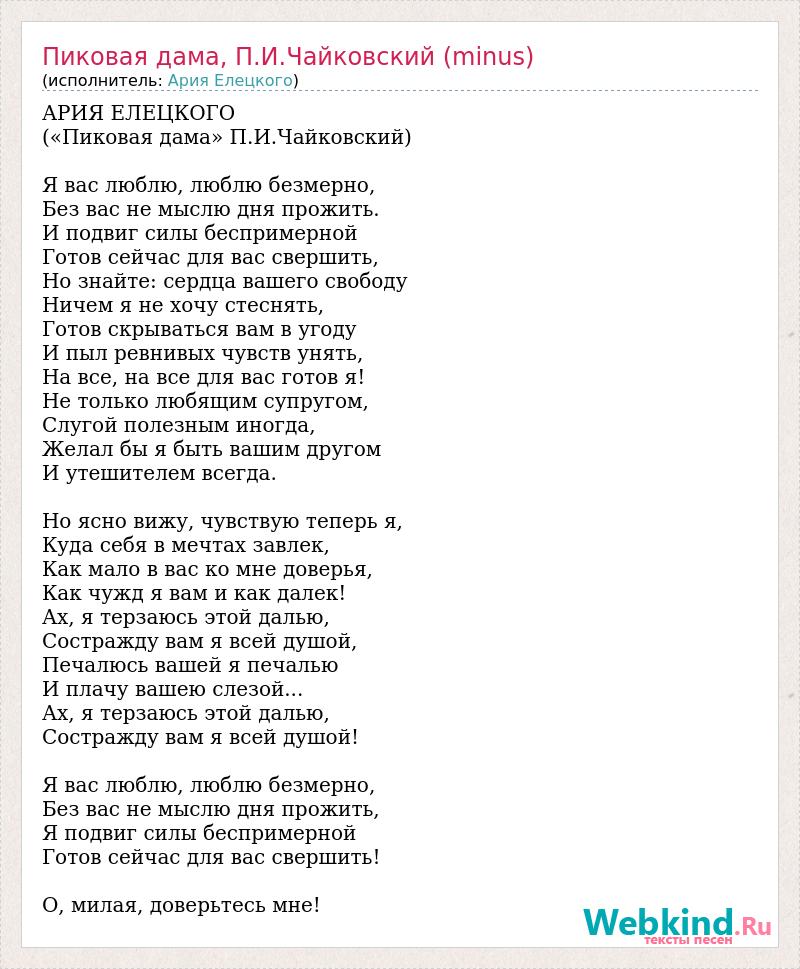 АРИЯ ЕЛЕЦКОГО («Пиковая дама» П.И.Чайковский) Я вас люблю, люблю безмерно, Без вас не мыслю дня прожить. И подвиг силы беспримерной Готов сейчас для вас свершить, Но знайте: сердца вашего свободу Ничем я не хочу стеснять, Готов скрываться вам в угоду И пыл ревнивых чувств унять, На все, на все для вас готов я! Не только любящим супругом, Слугой полезным иногда, Желал бы я быть вашим другом И утешителем всегда. Но ясно вижу, чувствую теперь я, Куда себя в мечтах завлек, Как мало в вас ко мне доверья, Как чужд я вам и как далек! Ах, я терзаюсь этой далью, Состражду вам я всей душой, Печалюсь вашей я печалью И плачу вашею слезой... Ах, я терзаюсь этой далью, Состражду вам я всей душой! Я вас люблю, люблю безмерно, Без вас не мыслю дня прожить, Я подвиг силы беспримерной Готов сейчас для вас свершить! О, милая, доверьтесь мне!