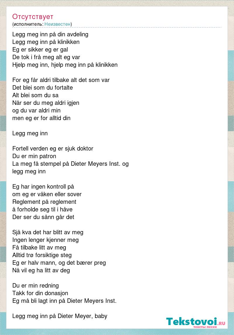 Legg meg inn på din avdeling Legg meg inn på klinikken Eg er sikker eg er gal De tok i frå meg alt eg var Hjelp meg inn, hjelp meg inn på klinikken For eg får aldri tilbake alt det som var Det blei som du fortalte Alt blei som du sa Når ser du meg aldri igjen og du var aldri min men eg er for alltid din Legg meg inn Fortell verden eg er sjuk doktor Du er min patron La meg få stempel på Dieter Meyers Inst. og legg meg inn Eg har ingen kontroll på om eg er våken eller sover Reglement på reglement å forholde seg til i håve Der ser du sånn går det Sjå kva det har blitt av meg Ingen lenger kjenner meg Få tilbake litt av meg Alltid trø forsiktige steg Eg er halv mann, og det bærer preg Nå vil eg ha litt av deg Du er min redning Takk for din donasjon Eg må bli lagt inn på Dieter Meyers Inst. Legg meg inn på Dieter Meyer, baby