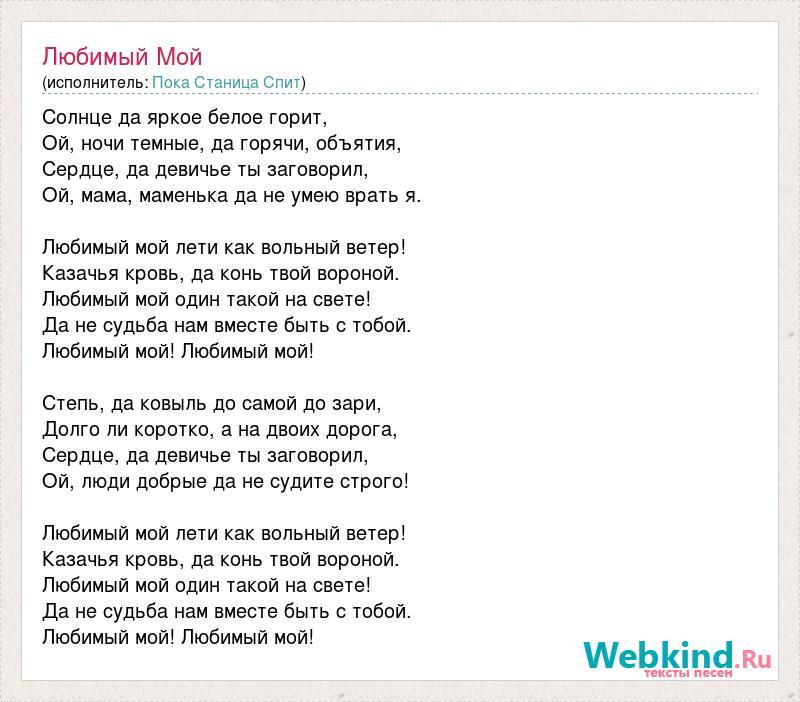 Солнце да яркое белое горит, Ой, ночи темные, да горячи, объятия, Сердце, да девичье ты заговорил, Ой, мама, маменька да не умею врать я. Любимый мой лети как вольный ветер! Казачья кровь, да конь твой вороной. Любимый мой один такой на свете! Да не судьба нам вместе быть с тобой. Любимый мой! Любимый мой! Степь, да ковыль до самой до зари, Долго ли коротко, а на двоих дорога, Сердце, да девичье ты заговорил, Ой, люди добрые да не судите строго! Любимый мой лети как вольный ветер! Казачья кровь, да конь твой вороной. Любимый мой один такой на свете! Да не судьба нам вместе быть с тобой. Любимый мой! Любимый мой!