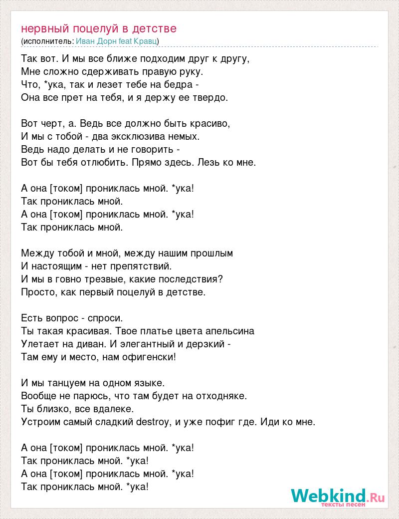 Так вот. И мы все ближе подходим друг к другу, Мне сложно сдерживать правую руку. Что, *ука, так и лезет тебе на бедра - Она все прет на тебя, и я держу ее твердо. Вот черт, а. Ведь все должно быть красиво, И мы с тобой - два эксклюзива немых. Ведь надо делать и не говорить - Вот бы тебя отлюбить. Прямо здесь. Лезь ко мне. А она [током] прониклась мной. *ука! Так прониклась мной. А она [током] прониклась мной. *ука! Так прониклась мной. Между тобой и мной, между нашим прошлым И настоящим - нет препятствий. И мы в говно трезвые, какие последствия? Просто, как первый поцелуй в детстве. Есть вопрос - спроси. Ты такая красивая. Твое платье цвета апельсина Улетает на диван. И элегантный и дерзкий - Там ему и место, нам офигенски! И мы танцуем на одном языке. Вообще не парюсь, что там будет на отходняке. Ты близко, все вдалеке. Устроим самый сладкий destroy, и уже пофиг где. Иди ко мне. А она [током] прониклась мной. *ука! Так прониклась мной. *ука! А она [током] прониклась мной. *ука! Так прониклась мной. *ука!