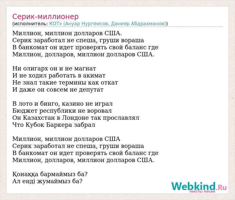 Миллион, миллион долларов США. Серик заработал не спеша, груши вораша В банкомат он идет проверять свой баланс где Миллион, долларов, миллион долларов США. Ни олигарх он и не магнат И не ходил работать в акимат Не знал такие термины как откат И даже он совсем не депутат В лото и бинго, казино не играл Бюджет республики не воровал Он Казахстан в Лондоне так прославлял Что Кубок Баркера забрал Миллион, миллион долларов США Серик заработал не спеша, груши вораша В банкомат он идет проверять свой баланс где Миллион, долларов, миллион долларов США. Қонаққа бармаймыз ба? Ал ендi жумаймыз ба?