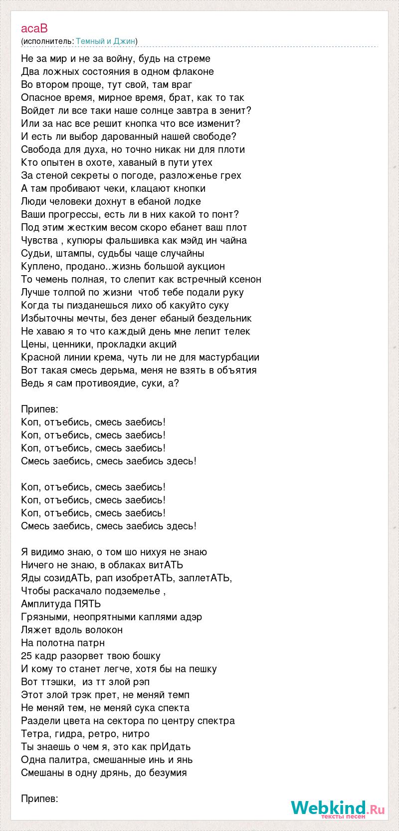 Не за мир и не за войну, будь на стреме Два ложных состояния в одном флаконе Во втором проще, тут свой, там враг Опасное время, мирное время, брат, как то так Войдет ли все таки наше солнце завтра в зенит? Или за нас все решит кнопка что все изменит? И есть ли выбор дарованный нашей свободе? Свобода для духа, но точно никак ни для плоти Кто опытен в охоте, хаваный в пути утех За стеной секреты о погоде, разложенье грех А там пробивают чеки, клацают кнопки Люди человеки дохнут в ебаной лодке Ваши прогрессы, есть ли в них какой то понт? Под этим жестким весом скоро ебанет ваш плот Чувства , купюры фальшивка как мэйд ин чайна Судьи, штампы, судьбы чаще случайны Куплено, продано..жизнь большой аукцион То чемень полная, то слепит как встречный ксенон Лучше толпой по жизни чтоб тебе подали руку Когда ты пизданешься лихо об какуйто суку Избыточны мечты, без денег ебаный бездельник Не хаваю я то что каждый день мне лепит телек Цены, ценники, прокладки акций Красной линии крема, чуть ли не для мастурбации Вот такая смесь дерьма, меня не взять в объятия Ведь я сам противоядие, суки, а? Припев: Коп, отъебись, смесь заебись! Коп, отъебись, смесь заебись! Коп, отъебись, смесь заебись! Смесь заебись, смесь заебись здесь! Коп, отъебись, смесь заебись! Коп, отъебись, смесь заебись! Коп, отъебись, смесь заебись! Смесь заебись, смесь заебись здесь! Я видимо знаю, о том шо нихуя не знаю Ничего не знаю, в облаках витАТЬ Яды созидАТЬ, рап изобретАТЬ, заплетАТЬ, Чтобы раскачало подземелье , Амплитуда ПЯТЬ Грязными, неопрятными каплями адэр Ляжет вдоль волокон На полотна патрн 25 кадр разорвет твою бошку И кому то станет легче, хотя бы на пешку Вот ттэшки, из тт злой рэп Этот злой трэк прет, не меняй темп Не меняй тем, не меняй сука спекта Раздели цвета на сектора по центру спектра Тетра, гидра, ретро, нитро Ты знаешь о чем я, это как прИдать Одна палитра, смешанные инь и янь Смешаны в одну дрянь, до безумия Припев: