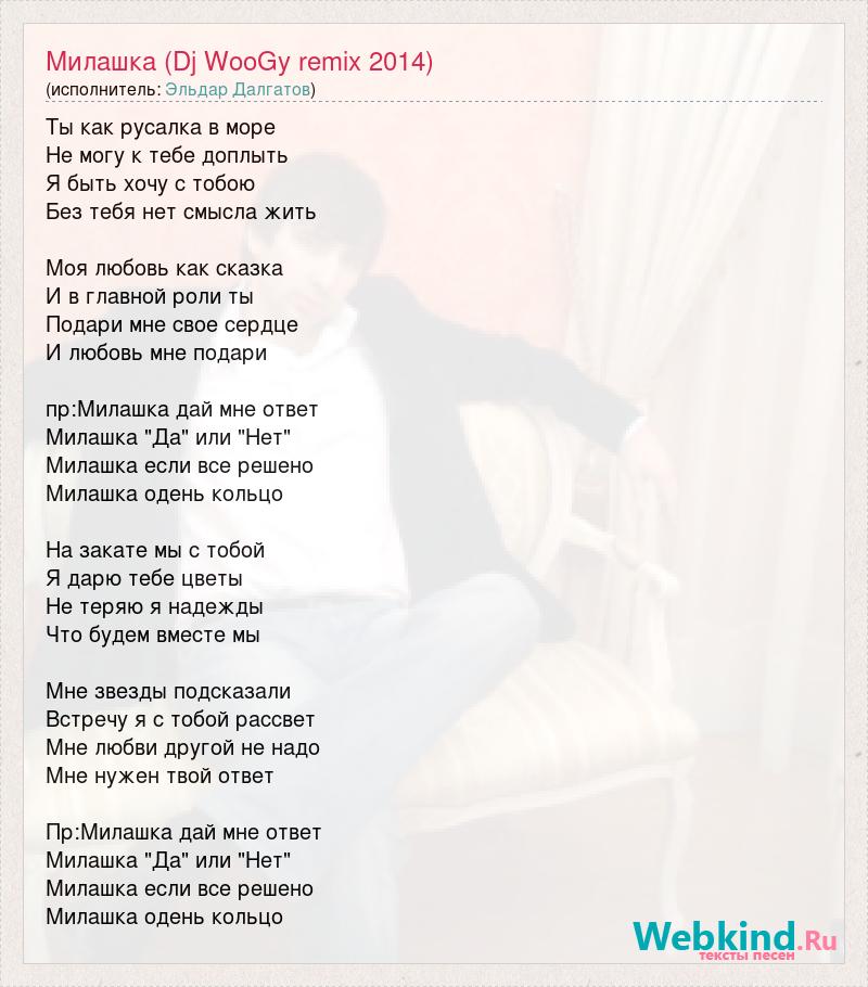Ты как русалка в море Не могу к тебе доплыть Я быть хочу с тобою Без тебя нет смысла жить Моя любовь как сказка И в главной роли ты Подари мне свое сердце И любовь мне подари пр:Милашка дай мне ответ Милашка "Да" или "Нет" Милашка если все решено Милашка одень кольцо На закате мы с тобой Я дарю тебе цветы Не теряю я надежды Что будем вместе мы Мне звезды подсказали Встречу я с тобой рассвет Мне любви другой не надо Мне нужен твой ответ Пр:Милашка дай мне ответ Милашка "Да" или "Нет" Милашка если все решено Милашка одень кольцо