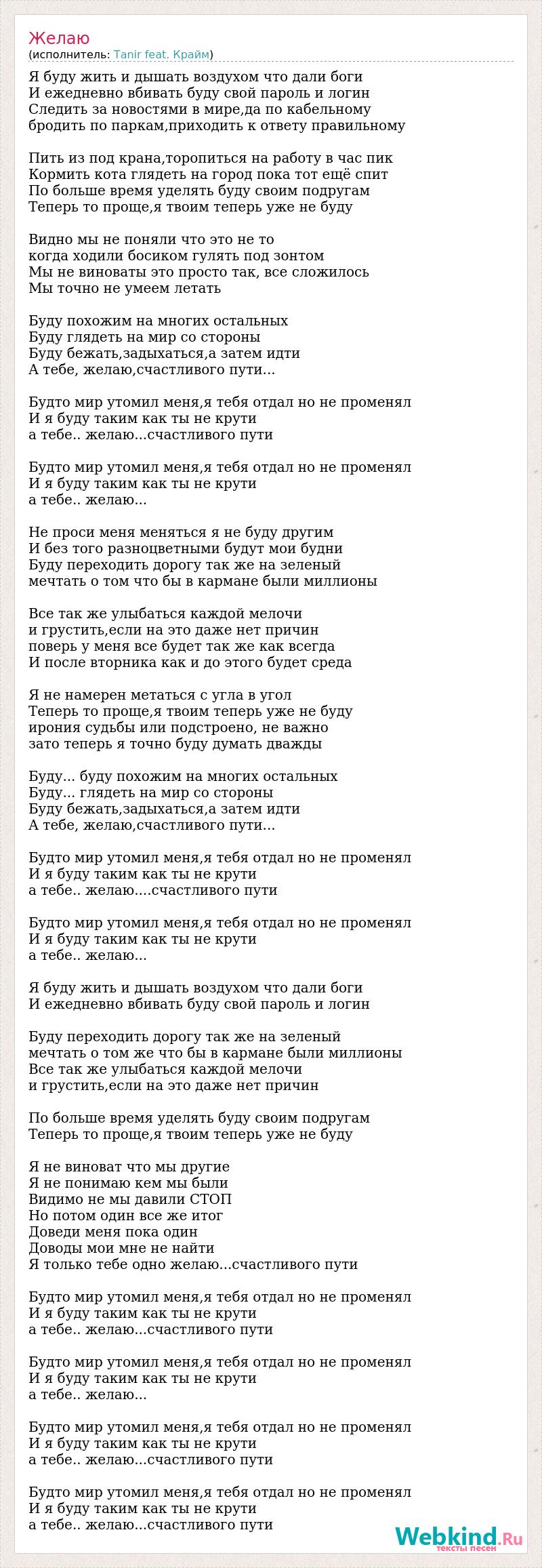 Я буду жить и дышать воздухом что дали боги И ежедневно вбивать буду свой пароль и логин Следить за новостями в мире,да по кабельному бродить по паркам,приходить к ответу правильному Пить из под крана,торопиться на работу в час пик Кормить кота глядеть на город пока тот ещё спит По больше время уделять буду своим подругам Теперь то проще,я твоим теперь уже не буду Видно мы не поняли что это не то когда ходили босиком гулять под зонтом Мы не виноваты это просто так, все сложилось Мы точно не умеем летать Буду похожим на многих остальных Буду глядеть на мир со стороны Буду бежать,задыхаться,а затем идти А тебе, желаю,счастливого пути... Будто мир утомил меня,я тебя отдал но не променял И я буду таким как ты не крути а тебе.. желаю...счастливого пути Будто мир утомил меня,я тебя отдал но не променял И я буду таким как ты не крути а тебе.. желаю... Не проси меня меняться я не буду другим И без того разноцветными будут мои будни Буду переходить дорогу так же на зеленый мечтать о том что бы в кармане были миллионы Все так же улыбаться каждой мелочи и грустить,если на это даже нет причин поверь у меня все будет так же как всегда И после вторника как и до этого будет среда Я не намерен метаться с угла в угол Теперь то проще,я твоим теперь уже не буду ирония судьбы или подстроено, не важно зато теперь я точно буду думать дважды Буду... буду похожим на многих остальных Буду... глядеть на мир со стороны Буду бежать,задыхаться,а затем идти А тебе, желаю,счастливого пути... Будто мир утомил меня,я тебя отдал но не променял И я буду таким как ты не крути а тебе.. желаю....счастливого пути Будто мир утомил меня,я тебя отдал но не променял И я буду таким как ты не крути а тебе.. желаю... Я буду жить и дышать воздухом что дали боги И ежедневно вбивать буду свой пароль и логин Буду переходить дорогу так же на зеленый мечтать о том же что бы в кармане были миллионы Все так же улыбаться каждой мелочи и грустить,если на это даже нет причин По больше время уделять буду своим подругам Теперь то проще,я твоим теперь уже не буду Я не виноват что мы другие Я не понимаю кем мы были Видимо не мы давили СТОП Но потом один все же итог Доведи меня пока один Доводы мои мне не найти Я только тебе одно желаю...счастливого пути Будто мир утомил меня,я тебя отдал но не променял И я буду таким как ты не крути а тебе.. желаю...счастливого пути Будто мир утомил меня,я тебя отдал но не променял И я буду таким как ты не крути а тебе.. желаю... Будто мир утомил меня,я тебя отдал но не променял И я буду таким как ты не крути а тебе.. желаю...счастливого пути Будто мир утомил меня,я тебя отдал но не променял И я буду таким как ты не крути а тебе.. желаю...счастливого пути
