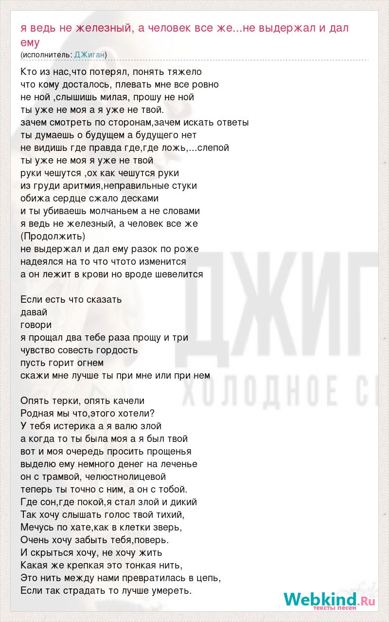 Кто из нас,что потерял, понять тяжело что кому досталось, плевать мне все ровно не ной ,слышишь милая, прошу не ной ты уже не моя а я уже не твой. зачем смотреть по сторонам,зачем искать ответы ты думаешь о будущем а будущего нет не видишь где правда где,где ложь,...слепой ты уже не моя я уже не твой руки чешутся ,ох как чешутся руки из груди аритмия,неправильные стуки обижа сердце сжало десками и ты убиваешь молчаньем а не словами я ведь не железный, а человек все же (Продолжить) не выдержал и дал ему разок по роже надеялся на то что чтото изменится а он лежит в крови но вроде шевелится Если есть что сказать давай говори я прощал два тебе раза прощу и три чувство совесть гордость пусть горит огнем скажи мне лучше ты при мне или при нем Опять терки, опять качели Родная мы что,этого хотели? У тебя истерика а я валю злой а когда то ты была моя а я был твой вот и моя очередь просить прощенья выделю ему немного денег на леченье он с трамвой, челюстнолицевой теперь ты точно с ним, а он с тобой. Где сон,где покой,я стал злой и дикий Так хочу слышать голос твой тихий, Мечусь по хате,как в клетки зверь, Очень хочу забыть тебя,поверь. И скрыться хочу, не хочу жить Какая же крепкая это тонкая нить, Это нить между нами превратилась в цепь, Если так страдать то лучше умереть.
