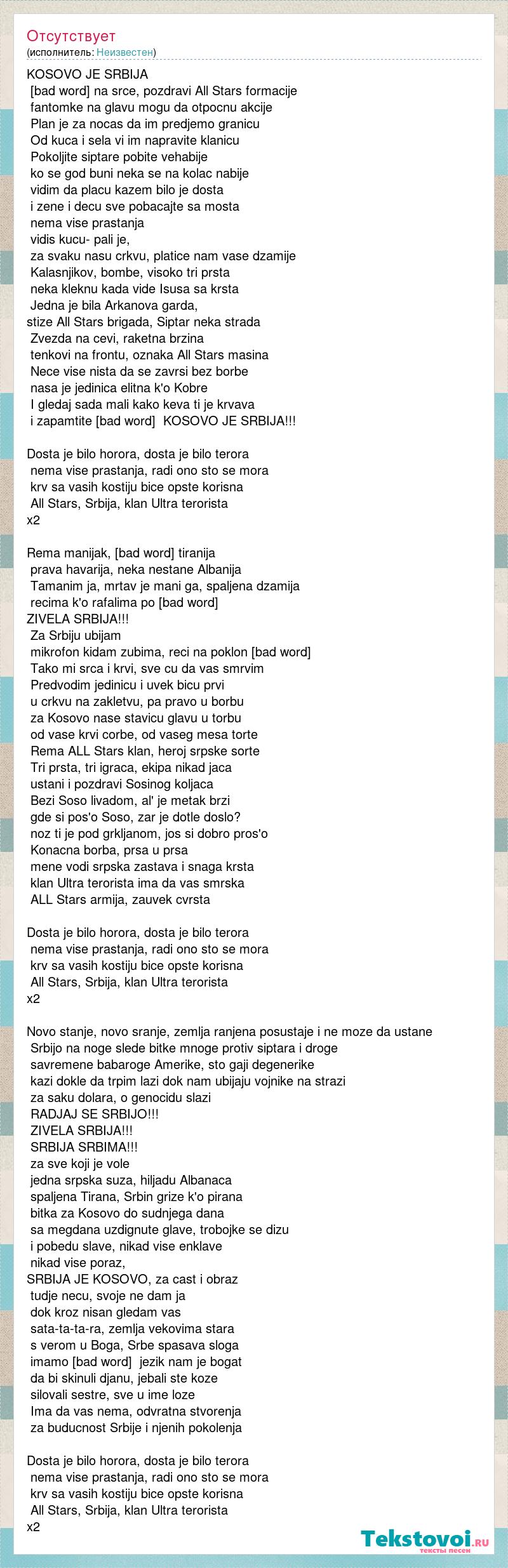 KOSOVO JE SRBIJA Ruke na srce, pozdravi All Stars formacije fantomke na glavu mogu da otpocnu akcije Plan je za nocas da im predjemo granicu Od kuca i sela vi im napravite klanicu Pokoljite siptare pobite vehabije ko se god buni neka se na kolac nabije vidim da placu kazem bilo je dosta i zene i decu sve pobacajte sa mosta nema vise prastanja vidis kucu- pali je, za svaku nasu crkvu, platice nam vase dzamije Kalasnjikov, bombe, visoko tri prsta neka kleknu kada vide Isusa sa krsta Jedna je bila Arkanova garda, stize All Stars brigada, Siptar neka strada Zvezda na cevi, raketna brzina tenkovi na frontu, oznaka All Stars masina Nece vise nista da se zavrsi bez borbe nasa je jedinica elitna k'o Kobre I gledaj sada mali kako keva ti je krvava i zapamtite poruku, KOSOVO JE SRBIJA!!! Dosta je bilo horora, dosta je bilo terora nema vise prastanja, radi ono sto se mora krv sa vasih kostiju bice opste korisna All Stars, Srbija, klan Ultra terorista x2 Rema manijak, brutalna tiranija prava havarija, neka nestane Albanija Tamanim ja, mrtav je mani ga, spaljena dzamija recima k'o rafalima po instrumentalima ZIVELA SRBIJA!!! Za Srbiju ubijam mikrofon kidam zubima, reci na poklon drugima Tako mi srca i krvi, sve cu da vas smrvim Predvodim jedinicu i uvek bicu prvi u crkvu na zakletvu, pa pravo u borbu za Kosovo nase stavicu glavu u torbu od vase krvi corbe, od vaseg mesa torte Rema ALL Stars klan, heroj srpske sorte Tri prsta, tri igraca, ekipa nikad jaca ustani i pozdravi Sosinog koljaca Bezi Soso livadom, al' je metak brzi gde si pos'o Soso, zar je dotle doslo? noz ti je pod grkljanom, jos si dobro pros'o Konacna borba, prsa u prsa mene vodi srpska zastava i snaga krsta klan Ultra terorista ima da vas smrska ALL Stars armija, zauvek cvrsta Dosta je bilo horora, dosta je bilo terora nema vise prastanja, radi ono sto se mora krv sa vasih kostiju bice opste korisna All Stars, Srbija, klan Ultra terorista x2 Novo stanje, novo sranje, zemlja ranjena posustaje i ne moze da ustane Srbijo na noge slede bitke mnoge protiv siptara i droge savremene babaroge Amerike, sto gaji degenerike kazi dokle da trpim lazi dok nam ubijaju vojnike na strazi za saku dolara, o genocidu slazi RADJAJ SE SRBIJO!!! ZIVELA SRBIJA!!! SRBIJA SRBIMA!!! za sve koji je vole jedna srpska suza, hiljadu Albanaca spaljena Tirana, Srbin grize k'o pirana bitka za Kosovo do sudnjega dana sa megdana uzdignute glave, trobojke se dizu i pobedu slave, nikad vise enklave nikad vise poraz, SRBIJA JE KOSOVO, za cast i obraz tudje necu, svoje ne dam ja dok kroz nisan gledam vas sata-ta-ta-ra, zemlja vekovima stara s verom u Boga, Srbe spasava sloga imamo kulturu, jezik nam je bogat da bi skinuli djanu, jebali ste koze silovali sestre, sve u ime loze Ima da vas nema, odvratna stvorenja za buducnost Srbije i njenih pokolenja Dosta je bilo horora, dosta je bilo terora nema vise prastanja, radi ono sto se mora krv sa vasih kostiju bice opste korisna All Stars, Srbija, klan Ultra terorista x2