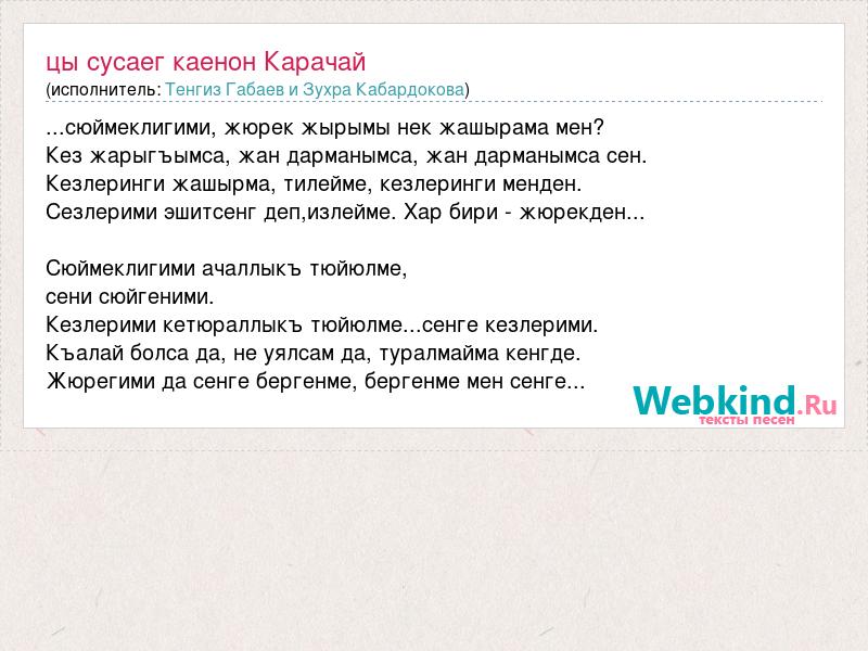 ...сюймеклигими, жюрек жырымы нек жашырама мен? Кез жарыгъымса, жан дарманымса, жан дарманымса сен. Кезлеринги жашырма, тилейме, кезлеринги менден. Сезлерими эшитсенг деп,излейме. Хар бири - жюрекден... Сюймеклигими ачаллыкъ тюйюлме, сени сюйгеними. Кезлерими кетюраллыкъ тюйюлме...сенге кезлерими. Къалай болса да, не уялсам да, туралмайма кенгде. Жюрегими да сенге бергенме, бергенме мен сенге...