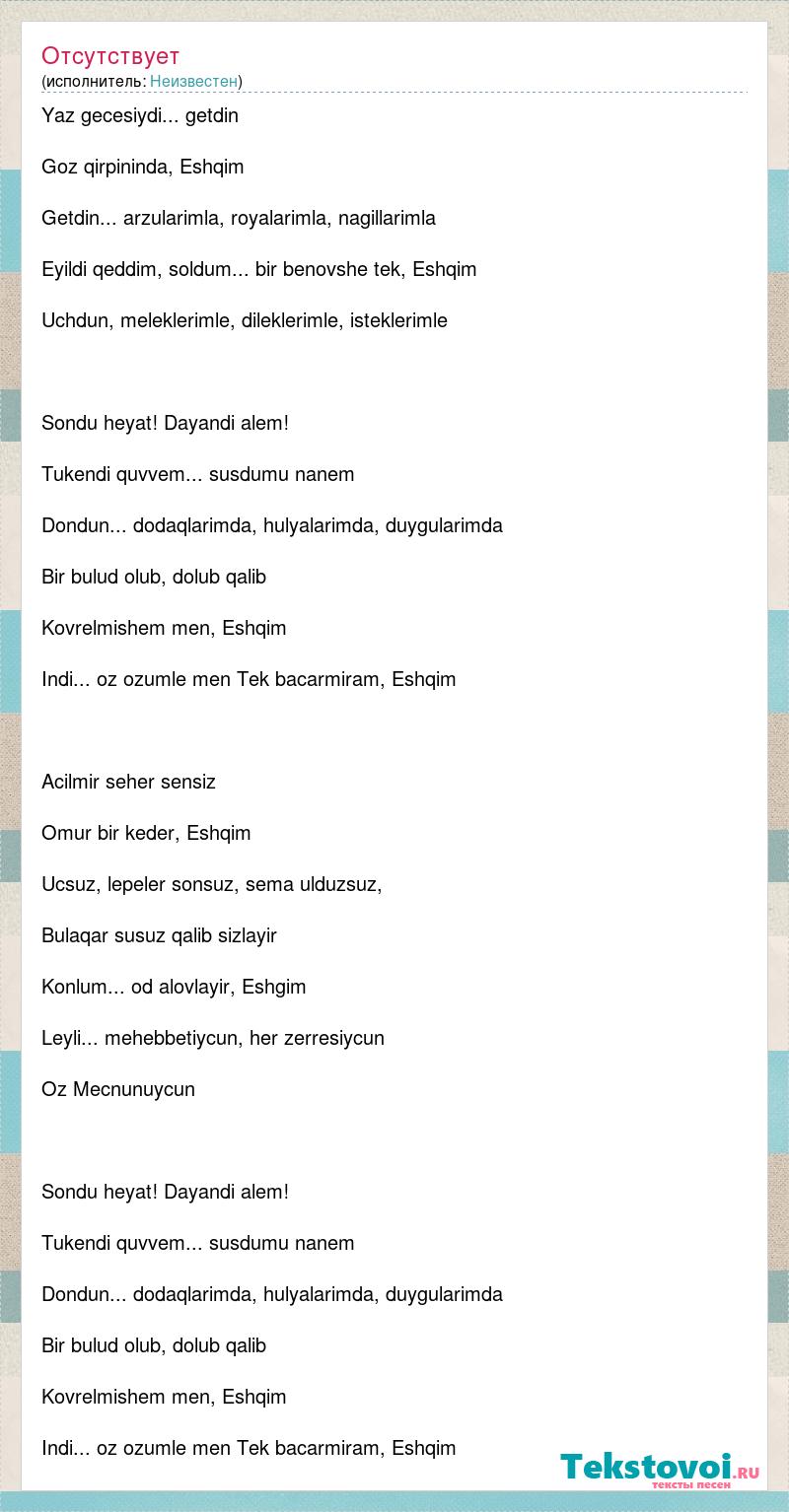 Yaz gecesiydi... getdin Goz qirpininda, Eshqim Getdin... arzularimla, royalarimla, nagillarimla Eyildi qeddim, soldum... bir benovshe tek, Eshqim Uchdun, meleklerimle, dileklerimle, isteklerimle Sondu heyat! Dayandi alem! Tukendi quvvem... susdumu nanem Dondun... dodaqlarimda, hulyalarimda, duygularimda Bir bulud olub, dolub qalib Kovrelmishem men, Eshqim Indi... oz ozumle men Tek bacarmiram, Eshqim Acilmir seher sensiz Omur bir keder, Eshqim Ucsuz, lepeler sonsuz, sema ulduzsuz, Bulaqar susuz qalib sizlayir Konlum... od alovlayir, Eshgim Leyli... mehebbetiycun, her zerresiycun Oz Mecnunuycun Sondu heyat! Dayandi alem! Tukendi quvvem... susdumu nanem Dondun... dodaqlarimda, hulyalarimda, duygularimda Bir bulud olub, dolub qalib Kovrelmishem men, Eshqim Indi... oz ozumle men Tek bacarmiram, Eshqim