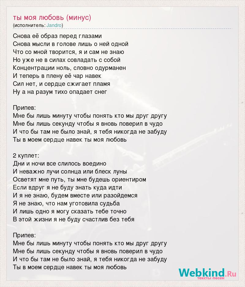 Снова её образ перед глазами Снова мысли в голове лишь о ней одной Что со мной творится, я и сам не знаю Но уже не в силах совладать с собой Концентрации ноль, словно одурманен И теперь в плену её чар навек Сил нет, и сердце сжигает пламя Ну а на разум тихо опадает снег Припев: Мне бы лишь минуту чтобы понять кто мы друг другу Мне бы лишь секунду чтобы я вновь поверил в чудо И что бы там не было знай, я тебя никогда не забуду Ты в моем сердце навек ты моя любовь 2 куплет: Дни и ночи все слилось воедино И неважно лучи солнца или блеск луны Осветят мне путь, ты мне будешь ориентиром Если вдруг я не буду знать куда идти И я не знаю, будем вместе или разойдемся Я не знаю, что нам уготовила судьба И лишь одно я могу сказать тебе точно В этой жизни я не буду счастлив без тебя Припев: Мне бы лишь минуту чтобы понять кто мы друг другу Мне бы лишь секунду чтобы я вновь поверил в чудо И что бы там не было знай, я тебя никогда не забуду Ты в моем сердце навек ты моя любовь