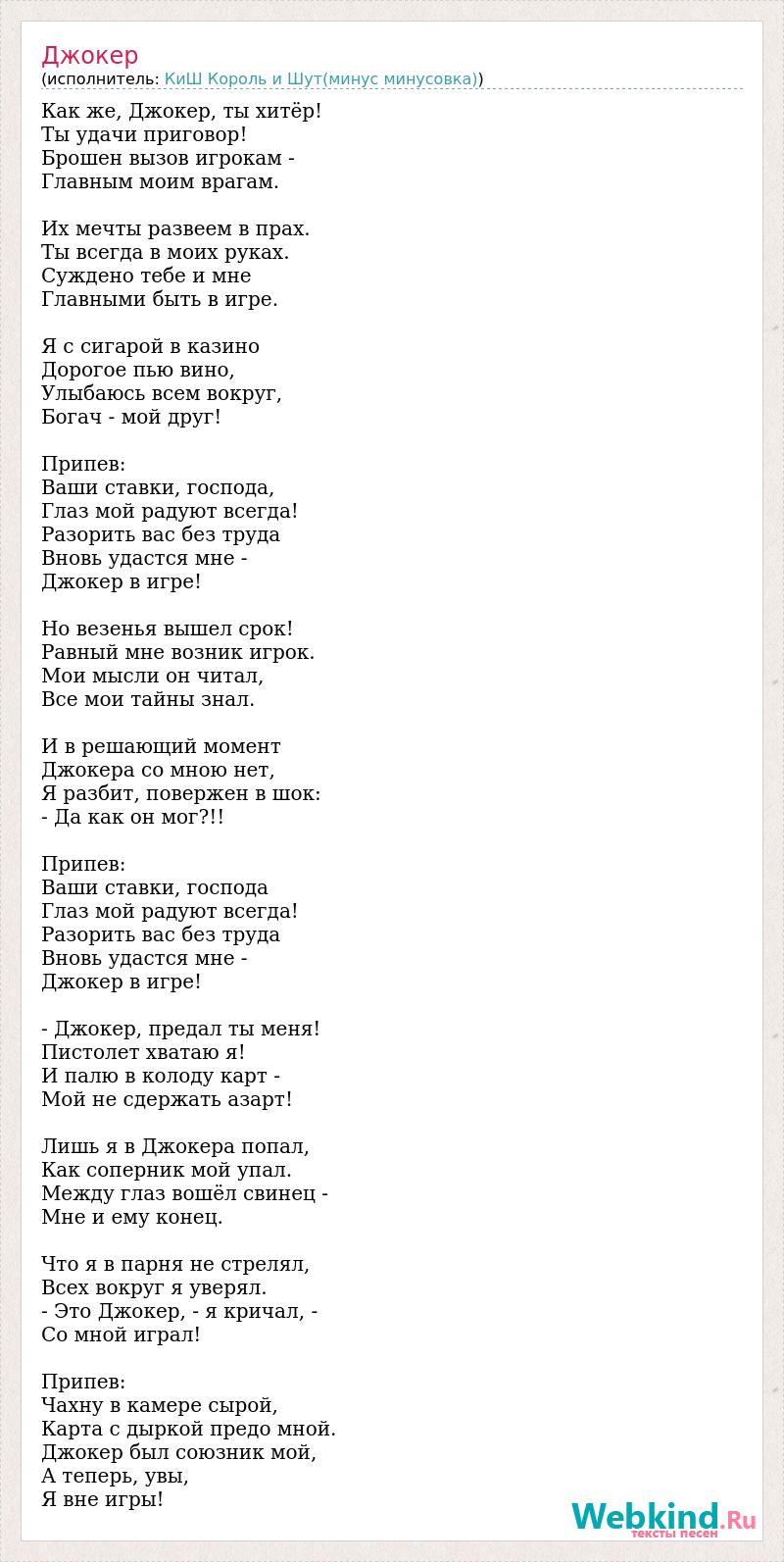 Как же, Джокер, ты хитёр! Ты удачи приговор! Брошен вызов игрокам - Главным моим врагам. Их мечты развеем в прах. Ты всегда в моих руках. Суждено тебе и мне Главными быть в игре. Я с сигарой в казино Дорогое пью вино, Улыбаюсь всем вокруг, Богач - мой друг! Припев: Ваши ставки, господа, Глаз мой радуют всегда! Разорить вас без труда Вновь удастся мне - Джокер в игре! Но везенья вышел срок! Равный мне возник игрок. Мои мысли он читал, Все мои тайны знал. И в решающий момент Джокера со мною нет, Я разбит, повержен в шок: - Да как он мог?!! Припев: Ваши ставки, господа Глаз мой радуют всегда! Разорить вас без труда Вновь удастся мне - Джокер в игре! - Джокер, предал ты меня! Пистолет хватаю я! И палю в колоду карт - Мой не сдержать азарт! Лишь я в Джокера попал, Как соперник мой упал. Между глаз вошёл свинец - Мне и ему конец. Что я в парня не стрелял, Всех вокруг я уверял. - Это Джокер, - я кричал, - Со мной играл! Припев: Чахну в камере сырой, Карта с дыркой предо мной. Джокер был союзник мой, А теперь, увы, Я вне игры!