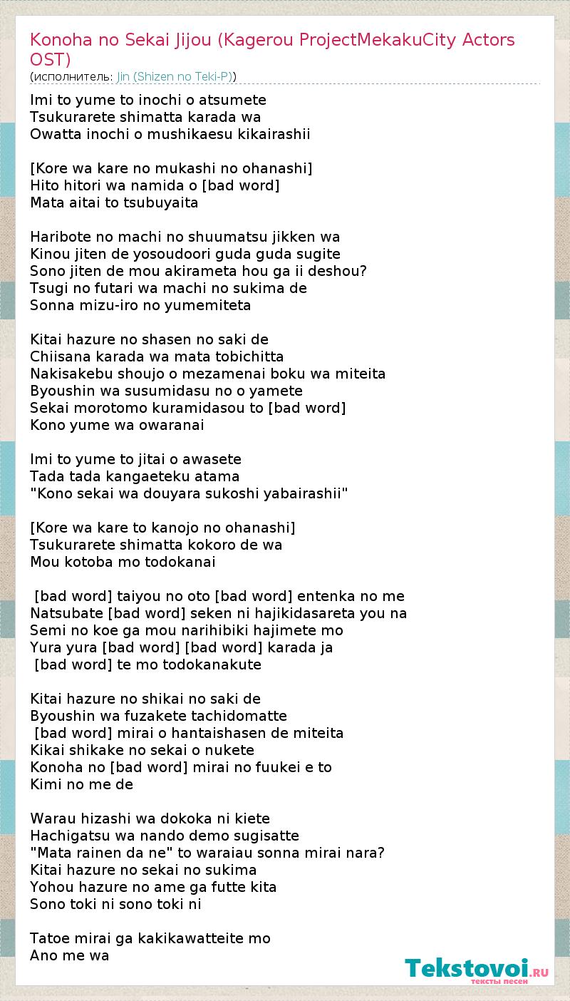 Главная→Исполнители→Jin (Shizen no Teki-P)→Konoha no Sekai Jijou (Kagerou Project/MekakuCity Actors OST)