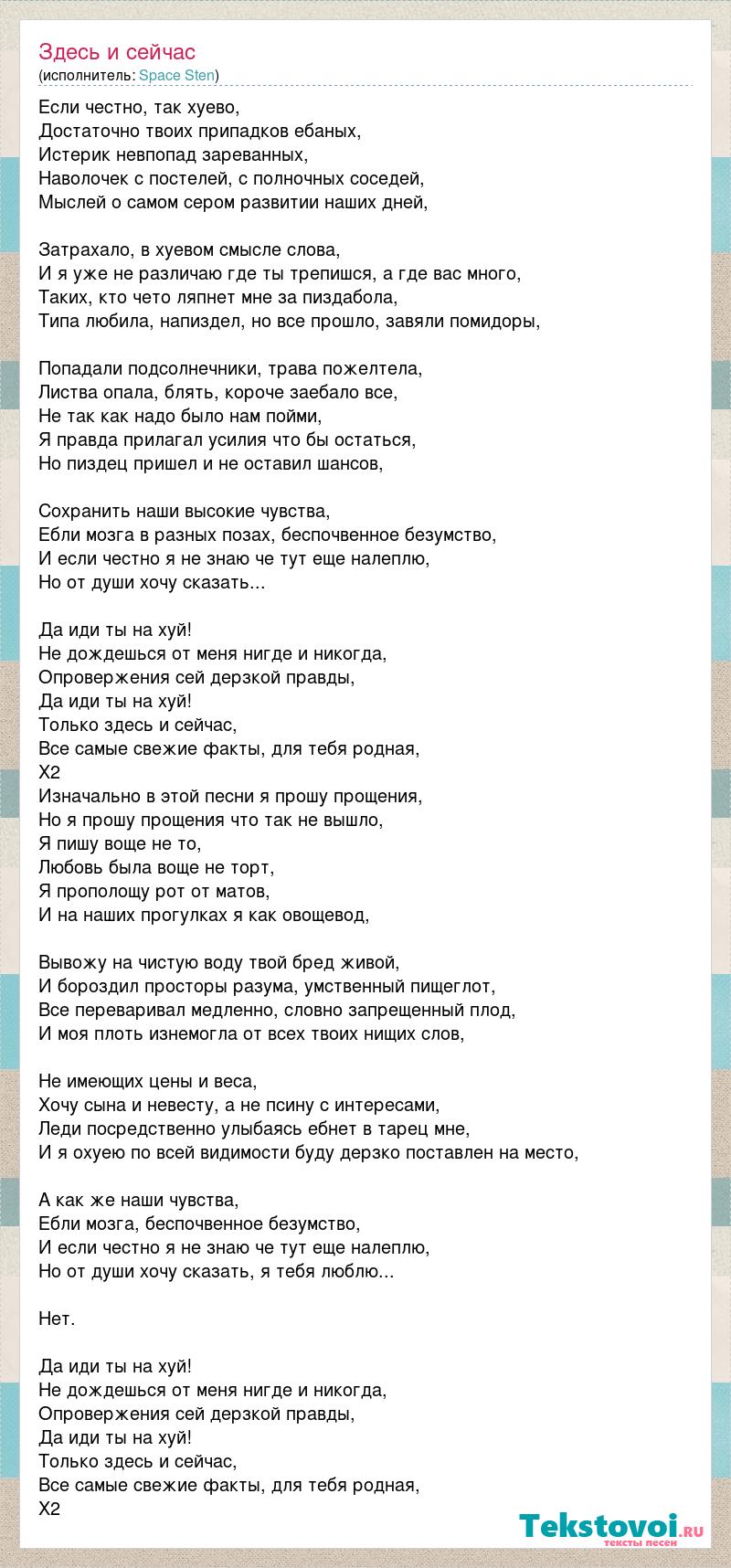 Если честно, так хуево, Достаточно твоих припадков ебаных, Истерик невпопад зареванных, Наволочек с постелей, с полночных соседей, Мыслей о самом сером развитии наших дней, Затрахало, в хуевом смысле слова, И я уже не различаю где ты трепишся, а где вас много, Таких, кто чето ляпнет мне за пиздабола, Типа любила, напиздел, но все прошло, завяли помидоры, Попадали подсолнечники, трава пожелтела, Листва опала, блять, короче заебало все, Не так как надо было нам пойми, Я правда прилагал усилия что бы остаться, Но пиздец пришел и не оставил шансов, Сохранить наши высокие чувства, Ебли мозга в разных позах, беспочвенное безумство, И если честно я не знаю че тут еще налеплю, Но от души хочу сказать... Да иди ты на хуй! Не дождешься от меня нигде и никогда, Опровержения сей дерзкой правды, Да иди ты на хуй! Только здесь и сейчас, Все самые свежие факты, для тебя родная, Х2 Изначально в этой песни я прошу прощения, Но я прошу прощения что так не вышло, Я пишу воще не то, Любовь была воще не торт, Я прополощу рот от матов, И на наших прогулках я как овощевод, Вывожу на чистую воду твой бред живой, И бороздил просторы разума, умственный пищеглот, Все переваривал медленно, словно запрещенный плод, И моя плоть изнемогла от всех твоих нищих слов, Не имеющих цены и веса, Хочу сына и невесту, а не псину с интересами, Леди посредственно улыбаясь ебнет в тарец мне, И я охуею по всей видимости буду дерзко поставлен на место, А как же наши чувства, Ебли мозга, беспочвенное безумство, И если честно я не знаю че тут еще налеплю, Но от души хочу сказать, я тебя люблю... Нет. Да иди ты на хуй! Не дождешься от меня нигде и никогда, Опровержения сей дерзкой правды, Да иди ты на хуй! Только здесь и сейчас, Все самые свежие факты, для тебя родная, Х2