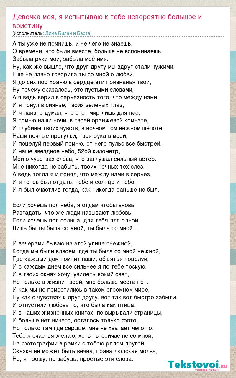 Главная→Исполнители→Дима Билан и Баста→Девочка моя, я испытываю к тебе невероятно большое и воистину