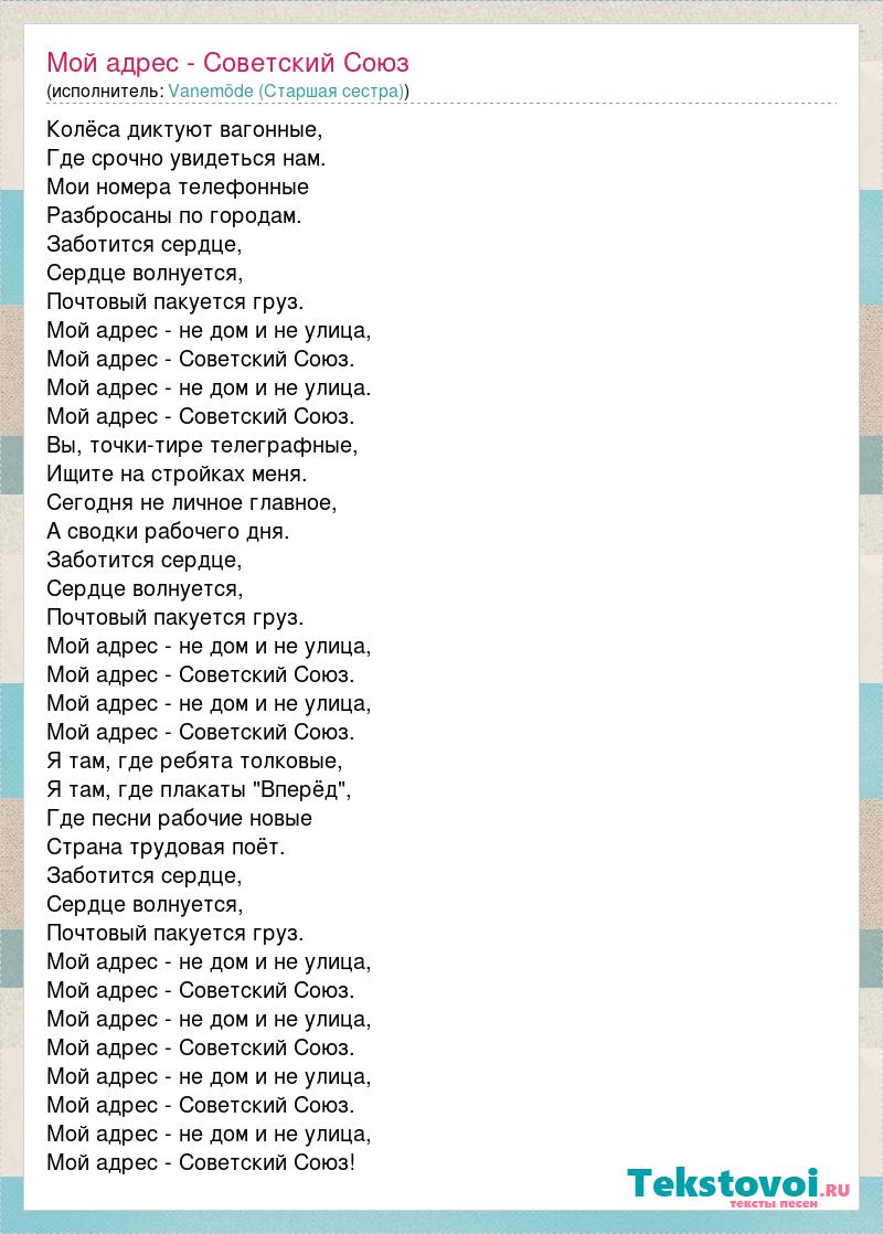 Колёса диктуют вагонные, Где срочно увидеться нам. Мои номера телефонные Разбросаны по городам. Заботится сердце, Сердце волнуется, Почтовый пакуется груз. Мой адрес - не дом и не улица, Мой адрес - Советский Союз. Мой адрес - не дом и не улица. Мой адрес - Советский Союз. Вы, точки-тире телеграфные, Ищите на стройках меня. Сегодня не личное главное, А сводки рабочего дня. Заботится сердце, Сердце волнуется, Почтовый пакуется груз. Мой адрес - не дом и не улица, Мой адрес - Советский Союз. Мой адрес - не дом и не улица, Мой адрес - Советский Союз. Я там, где ребята толковые, Я там, где плакаты "Вперёд", Где песни рабочие новые Страна трудовая поёт. Заботится сердце, Сердце волнуется, Почтовый пакуется груз. Мой адрес - не дом и не улица, Мой адрес - Советский Союз. Мой адрес - не дом и не улица, Мой адрес - Советский Союз. Мой адрес - не дом и не улица, Мой адрес - Советский Союз. Мой адрес - не дом и не улица, Мой адрес - Советский Союз!