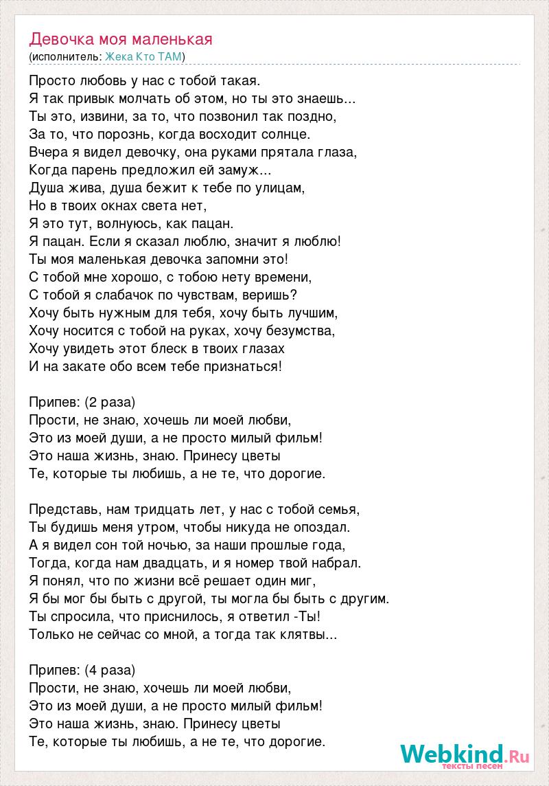 Просто любовь у нас с тобой такая. Я так привык молчать об этом, но ты это знаешь... Ты это, извини, за то, что позвонил так поздно, За то, что порознь, когда восходит солнце. Вчера я видел девочку, она руками прятала глаза, Когда парень предложил ей замуж... Душа жива, душа бежит к тебе по улицам, Но в твоих окнах света нет, Я это тут, волнуюсь, как пацан. Я пацан. Если я сказал люблю, значит я люблю! Ты моя маленькая девочка запомни это! С тобой мне хорошо, с тобою нету времени, С тобой я слабачок по чувствам, веришь? Хочу быть нужным для тебя, хочу быть лучшим, Хочу носится с тобой на руках, хочу безумства, Хочу увидеть этот блеск в твоих глазах И на закате обо всем тебе признаться! Припев: (2 раза) Прости, не знаю, хочешь ли моей любви, Это из моей души, а не просто милый фильм! Это наша жизнь, знаю. Принесу цветы Те, которые ты любишь, а не те, что дорогие. Представь, нам тридцать лет, у нас с тобой семья, Ты будишь меня утром, чтобы никуда не опоздал. А я видел сон той ночью, за наши прошлые года, Тогда, когда нам двадцать, и я номер твой набрал. Я понял, что по жизни всё решает один миг, Я бы мог бы быть с другой, ты могла бы быть с другим. Ты спросила, что приснилось, я ответил -Ты! Только не сейчас со мной, а тогда так клятвы... Припев: (4 раза) Прости, не знаю, хочешь ли моей любви, Это из моей души, а не просто милый фильм! Это наша жизнь, знаю. Принесу цветы Те, которые ты любишь, а не те, что дорогие.