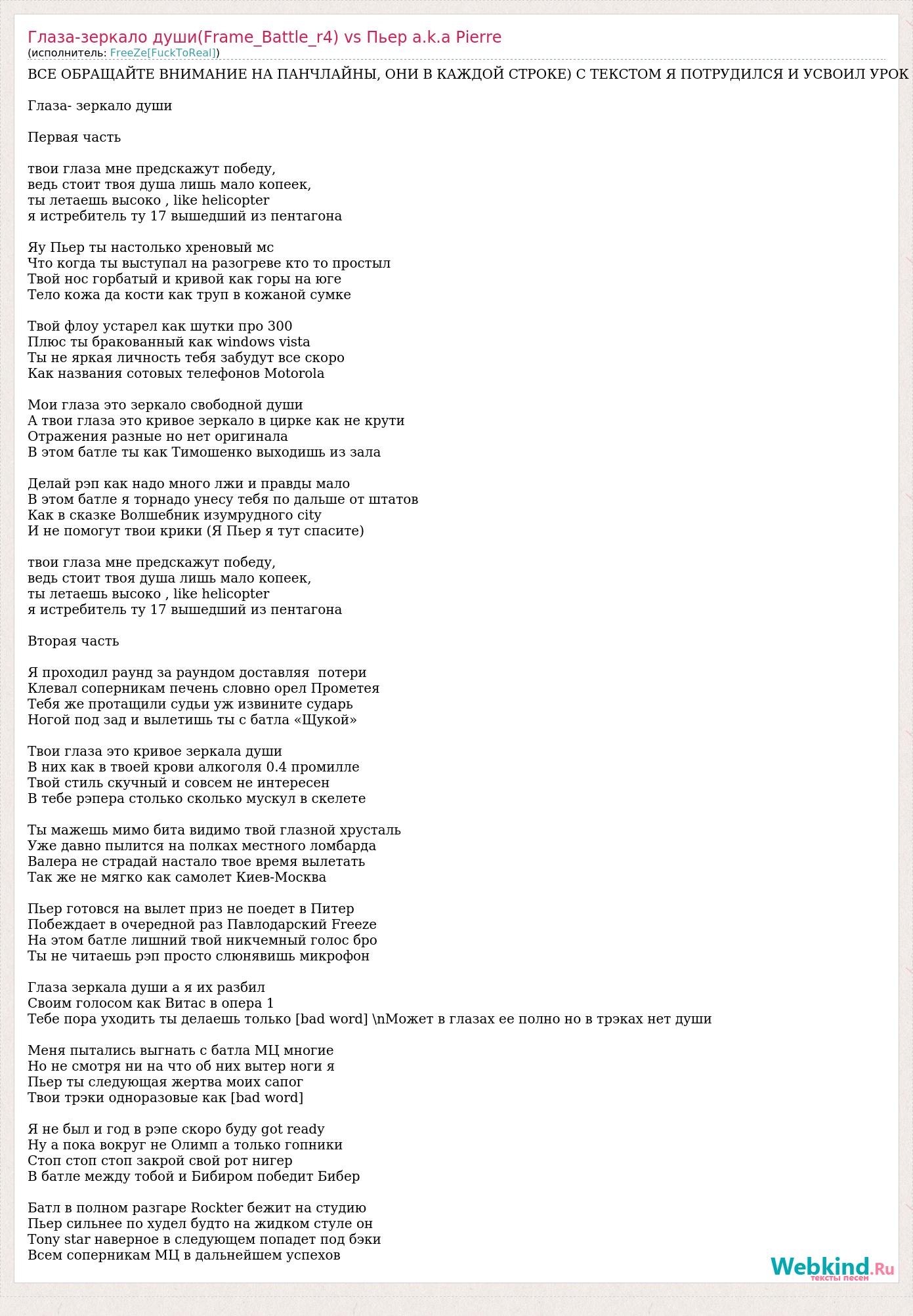 ВСЕ ОБРАЩАЙТЕ ВНИМАНИЕ НА ПАНЧЛАЙНЫ, ОНИ В КАЖДОЙ СТРОКЕ) С ТЕКСТОМ Я ПОТРУДИЛСЯ И УСВОИЛ УРОК Глаза- зеркало души Первая часть твои глаза мне предскажут победу, ведь стоит твоя душа лишь мало копеек, ты летаешь высоко , like helicopter я истребитель ту 17 вышедший из пентагона Яу Пьер ты настолько хреновый мс Что когда ты выступал на разогреве кто то простыл Твой нос горбатый и кривой как горы на юге Тело кожа да кости как труп в кожаной сумке Твой флоу устарел как шутки про 300 Плюс ты бракованный как windows vista Ты не яркая личность тебя забудут все скоро Как названия сотовых телефонов Motorola Мои глаза это зеркало свободной души А твои глаза это кривое зеркало в цирке как не крути Отражения разные но нет оригинала В этом батле ты как Тимошенко выходишь из зала Делай рэп как надо много лжи и правды мало В этом батле я торнадо унесу тебя по дальше от штатов Как в сказке Волшебник изумрудного city И не помогут твои крики (Я Пьер я тут спасите) твои глаза мне предскажут победу, ведь стоит твоя душа лишь мало копеек, ты летаешь высоко , like helicopter я истребитель ту 17 вышедший из пентагона Вторая часть Я проходил раунд за раундом доставляя потери Клевал соперникам печень словно орел Прометея Тебя же протащили судьи уж извините сударь Ногой под зад и вылетишь ты с батла «Щукой» Твои глаза это кривое зеркала души В них как в твоей крови алкоголя 0.4 промилле Твой стиль скучный и совсем не интересен В тебе рэпера столько сколько мускул в скелете Ты мажешь мимо бита видимо твой глазной хрусталь Уже давно пылится на полках местного ломбарда Валера не страдай настало твое время вылетать Так же не мягко как самолет Киев-Москва Пьер готовся на вылет приз не поедет в Питер Побеждает в очередной раз Павлодарский Freeze На этом батле лишний твой никчемный голос бро Ты не читаешь рэп просто слюнявишь микрофон Глаза зеркала души а я их разбил Своим голосом как Витас в опера 1 Тебе пора уходить ты делаешь только [bad word] \nМожет в глазах ее полно но в трэках нет души Меня пытались выгнать с батла МЦ многие Но не смотря ни на что об них вытер ноги я Пьер ты следующая жертва моих сапог Твои трэки одноразовые как [bad word] Я не был и год в рэпе скоро буду got ready Ну а пока вокруг не Олимп а только гопники Стоп стоп стоп закрой свой рот нигер В батле между тобой и Бибиром победит Бибер Батл в полном разгаре Rockter бежит на студию Пьер сильнее по худел будто на жидком стуле он Tony star наверное в следующем попадет под бэки Всем соперникам МЦ в дальнейшем успехов