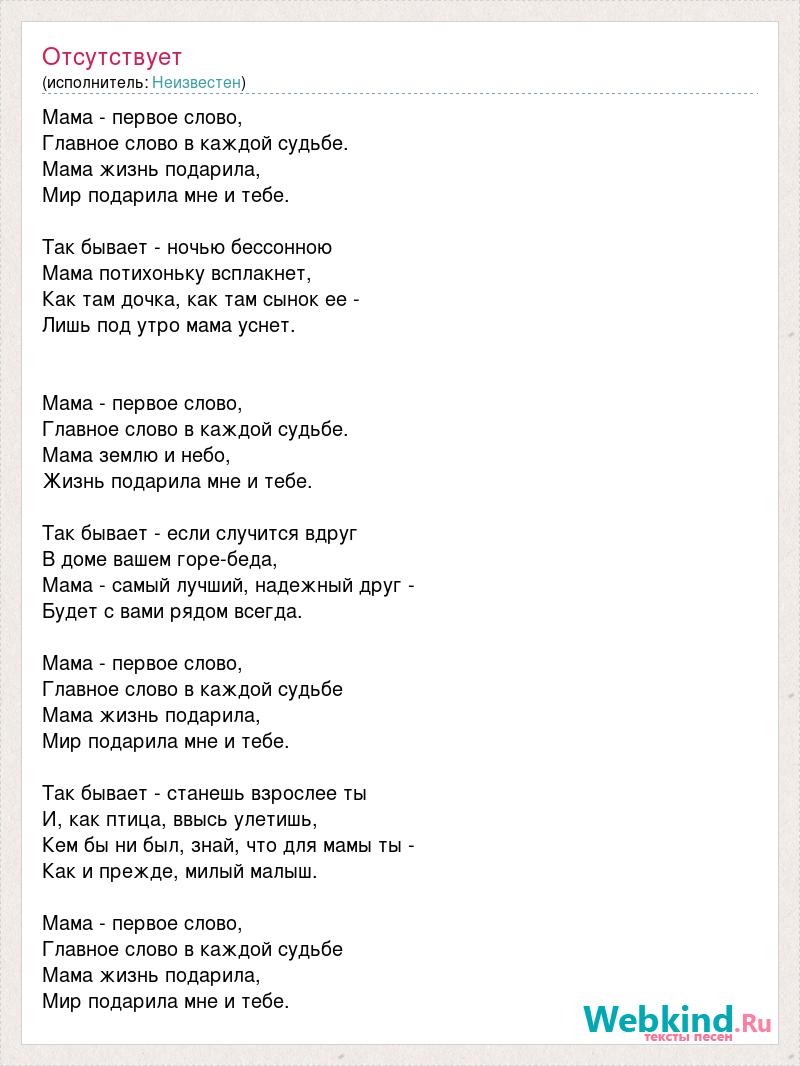 Мама - первое слово, Главное слово в каждой судьбе. Мама жизнь подарила, Мир подарила мне и тебе. Так бывает - ночью бессонною Мама потихоньку всплакнет, Как там дочка, как там сынок ее - Лишь под утро мама уснет. Мама - первое слово, Главное слово в каждой судьбе. Мама землю и небо, Жизнь подарила мне и тебе. Так бывает - если случится вдруг В доме вашем горе-беда, Мама - самый лучший, надежный друг - Будет с вами рядом всегда. Мама - первое слово, Главное слово в каждой судьбе Мама жизнь подарила, Мир подарила мне и тебе. Так бывает - станешь взрослее ты И, как птица, ввысь улетишь, Кем бы ни был, знай, что для мамы ты - Как и прежде, милый малыш. Мама - первое слово, Главное слово в каждой судьбе Мама жизнь подарила, Мир подарила мне и тебе.