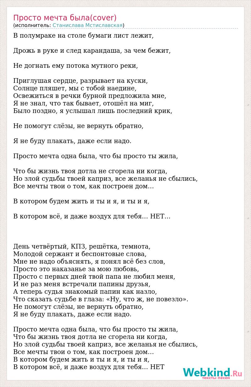 В полумраке на столе бумаги лист лежит, Дрожь в руке и след карандаша, за чем бежит, Не догнать ему потока мутного реки, Приглушая сердце, разрывает на куски, Солнце пляшет, мы с тобой наедине, Освежиться в речки бурной предложила мне, Я не знал, что так бывает, отошёл на миг, Было поздно, я услышал лишь последний крик, Не помогут слёзы, не вернуть обратно, Я не буду плакать, даже если надо. Просто мечта одна была, что бы просто ты жила, Что бы жизнь твоя дотла не сгорела ни когда, Но злой судьбы твоей каприз, все желанья не сбылись, Все мечты твои о том, как построен дом… В котором будем жить и ты и я, и ты и я, В котором всё, и даже воздух для тебя… НЕТ… День четвёртый, КПЗ, решётка, темнота, Молодой сержант и беспонтовые слова, Мне не надо объяснять, я понял всё без слов, Просто это наказанье за мою любовь, Просто с первых дней твой папа не любил меня, И не раз меня встречали папины друзья, А теперь судья знакомый папин как назло, Что сказать судьбе в глаза: «Ну, что ж, не повезло». Не помогут слёзы, не вернуть обратно, Я не буду плакать, даже если надо. Просто мечта одна была, что бы просто ты жила, Что бы жизнь твоя дотла не сгорела ни когда, Но злой судьбы твоей каприз, все желанья не сбылись, Все мечты твои о том, как построен дом… В котором будем жить и ты и я, и ты и я, В котором всё, и даже воздух для тебя… НЕТ