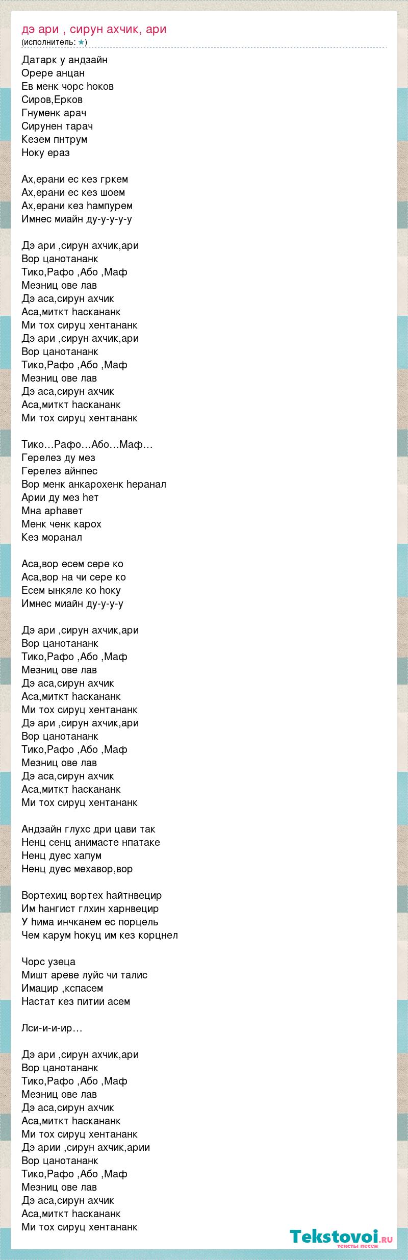 Датарк у андзайн Орерe анцан Ев менк чорс hоков Сиров,Ерков Гнуменк арач Сирунен тарач Кезем пнтрум Hоку ераз Ах,ерани ес кез гркем Ах,ерани ес кез шоем Ах,ерани кез hампурем Имнес миайн ду-у-у-у-у Дэ ари ,сирун ахчик,ари Вор цанотананк Тико,Рафо ,Або ,Маф Мезниц ове лав Дэ аса,сирун ахчик Аса,миткт hаскананк Ми тох сируц хентананк Дэ ари ,сирун ахчик,ари Вор цанотананк Тико,Рафо ,Або ,Маф Мезниц ове лав Дэ аса,сирун ахчик Аса,миткт hаскананк Ми тох сируц хентананк Тико…Рафо…Або…Маф… Герелез ду мез Герелез айнпес Вор менк анкарохенк hеранал Арии ду мез hет Мна арhавет Менк ченк карох Кез моранал Аса,вор есем серe ко Аса,вор на чи серe ко Есем ынкяле ко hоку Имнес миайн ду-у-у-у Дэ ари ,сирун ахчик,ари Вор цанотананк Тико,Рафо ,Або ,Маф Мезниц ове лав Дэ аса,сирун ахчик Аса,миткт hаскананк Ми тох сируц хентананк Дэ ари ,сирун ахчик,ари Вор цанотананк Тико,Рафо ,Або ,Маф Мезниц ове лав Дэ аса,сирун ахчик Аса,миткт hаскананк Ми тох сируц хентананк Андзайн глухс дри цави так Hенц сенц анимасте нпатаке Hенц дуес хапум Hенц дуес мехавор,вор Вортехиц вортех hайтнвецир Им hангист глхин харнвецир У hима инчканем ес порцель Чем карум hокуц им кез корцнел Чорс узеца Мишт ареве луйс чи талис Имацир ,кспасем Hастат кез питии асем Лси-и-и-ир… Дэ ари ,сирун ахчик,ари Вор цанотананк Тико,Рафо ,Або ,Маф Мезниц ове лав Дэ аса,сирун ахчик Аса,миткт hаскананк Ми тох сируц хентананк Дэ арии ,сирун ахчик,арии Вор цанотананк Тико,Рафо ,Або ,Маф Мезниц ове лав Дэ аса,сирун ахчик Аса,миткт hаскананк Ми тох сируц хентананк