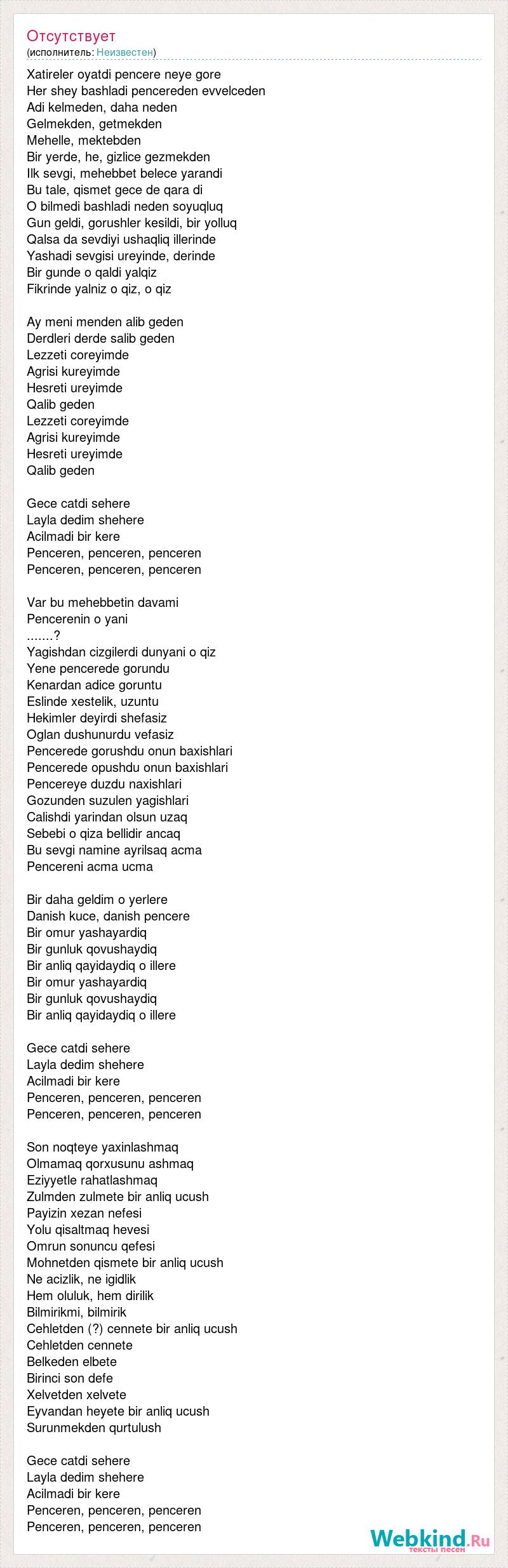 Xatireler oyatdi pencere neye gore Her shey bashladi pencereden evvelceden Adi kelmeden, daha neden Gelmekden, getmekden Mehelle, mektebden Bir yerde, he, gizlice gezmekden Ilk sevgi, mehebbet belece yarandi Bu tale, qismet gece de qara di O bilmedi bashladi neden soyuqluq Gun geldi, gorushler kesildi, bir yolluq Qalsa da sevdiyi ushaqliq illerinde Yashadi sevgisi ureyinde, derinde Bir gunde o qaldi yalqiz Fikrinde yalniz o qiz, o qiz Ay meni menden alib geden Derdleri derde salib geden Lezzeti coreyimde Agrisi kureyimde Hesreti ureyimde Qalib geden Lezzeti coreyimde Agrisi kureyimde Hesreti ureyimde Qalib geden Gece catdi sehere Layla dedim shehere Acilmadi bir kere Penceren, penceren, penceren Penceren, penceren, penceren Var bu mehebbetin davami Pencerenin o yani .......? Yagishdan cizgilerdi dunyani o qiz Yene pencerede gorundu Kenardan adice goruntu Eslinde xestelik, uzuntu Hekimler deyirdi shefasiz Oglan dushunurdu vefasiz Pencerede gorushdu onun baxishlari Pencerede opushdu onun baxishlari Pencereye duzdu naxishlari Gozunden suzulen yagishlari Calishdi yarindan olsun uzaq Sebebi o qiza bellidir ancaq Bu sevgi namine ayrilsaq acma Pencereni acma ucma Bir daha geldim o yerlere Danish kuce, danish pencere Bir omur yashayardiq Bir gunluk qovushaydiq Bir anliq qayidaydiq o illere Bir omur yashayardiq Bir gunluk qovushaydiq Bir anliq qayidaydiq o illere Gece catdi sehere Layla dedim shehere Acilmadi bir kere Penceren, penceren, penceren Penceren, penceren, penceren Son noqteye yaxinlashmaq Olmamaq qorxusunu ashmaq Eziyyetle rahatlashmaq Zulmden zulmete bir anliq ucush Payizin xezan nefesi Yolu qisaltmaq hevesi Omrun sonuncu qefesi Mohnetden qismete bir anliq ucush Ne acizlik, ne igidlik Hem oluluk, hem dirilik Bilmirikmi, bilmirik Cehletden (?) cennete bir anliq ucush Cehletden cennete Belkeden elbete Birinci son defe Xelvetden xelvete Eyvandan heyete bir anliq ucush Surunmekden qurtulush Gece catdi sehere Layla dedim shehere Acilmadi bir kere Penceren, penceren, penceren Penceren, penceren, penceren