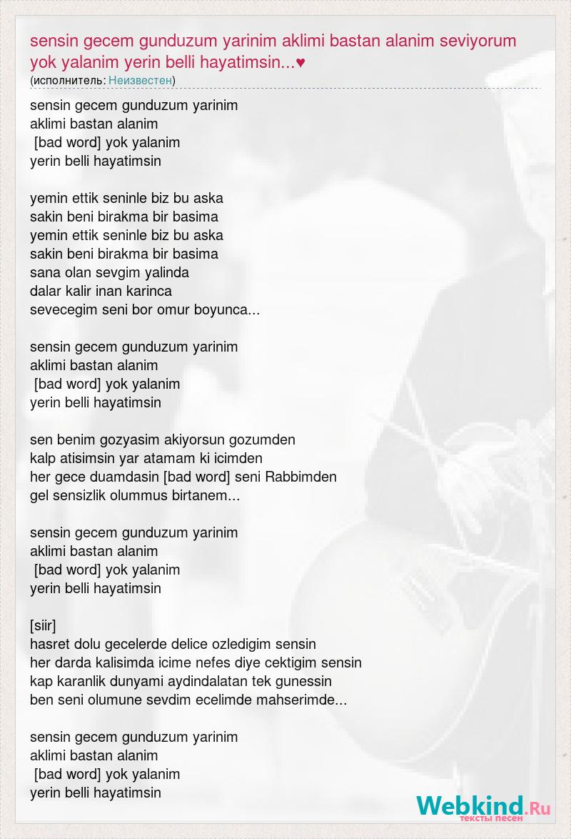 sensin gecem gunduzum yarinim aklimi bastan alanim [bad word] yok yalanim yerin belli hayatimsin yemin ettik seninle biz bu aska sakin beni birakma bir basima yemin ettik seninle biz bu aska sakin beni birakma bir basima sana olan sevgim yalinda dalar kalir inan karinca sevecegim seni bor omur boyunca... sensin gecem gunduzum yarinim aklimi bastan alanim [bad word] yok yalanim yerin belli hayatimsin sen benim gozyasim akiyorsun gozumden kalp atisimsin yar atamam ki icimden her gece duamdasin [bad word] seni Rabbimden gel sensizlik olummus birtanem... sensin gecem gunduzum yarinim aklimi bastan alanim [bad word] yok yalanim yerin belli hayatimsin [siir] hasret dolu gecelerde delice ozledigim sensin her darda kalisimda icime nefes diye cektigim sensin kap karanlik dunyami aydindalatan tek gunessin ben seni olumune sevdim ecelimde mahserimde... sensin gecem gunduzum yarinim aklimi bastan alanim [bad word] yok yalanim yerin belli hayatimsin