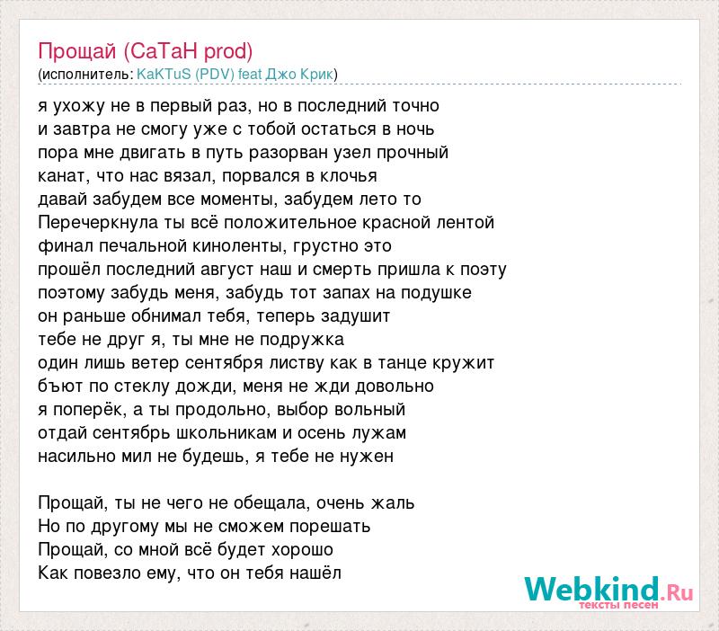 я ухожу не в первый раз, но в последний точно и завтра не смогу уже с тобой остаться в ночь пора мне двигать в путь разорван узел прочный канат, что нас вязал, порвался в клочья давай забудем все моменты, забудем лето то Перечеркнула ты всё положительное красной лентой финал печальной киноленты, грустно это прошёл последний август наш и смерть пришла к поэту поэтому забудь меня, забудь тот запах на подушке он раньше обнимал тебя, теперь задушит тебе не друг я, ты мне не подружка один лишь ветер сентября листву как в танце кружит бъют по стеклу дожди, меня не жди довольно я поперёк, а ты продольно, выбор вольный отдай сентябрь школьникам и осень лужам насильно мил не будешь, я тебе не нужен Прощай, ты не чего не обещала, очень жаль Но по другому мы не сможем порешать Прощай, со мной всё будет хорошо Как повезло ему, что он тебя нашёл