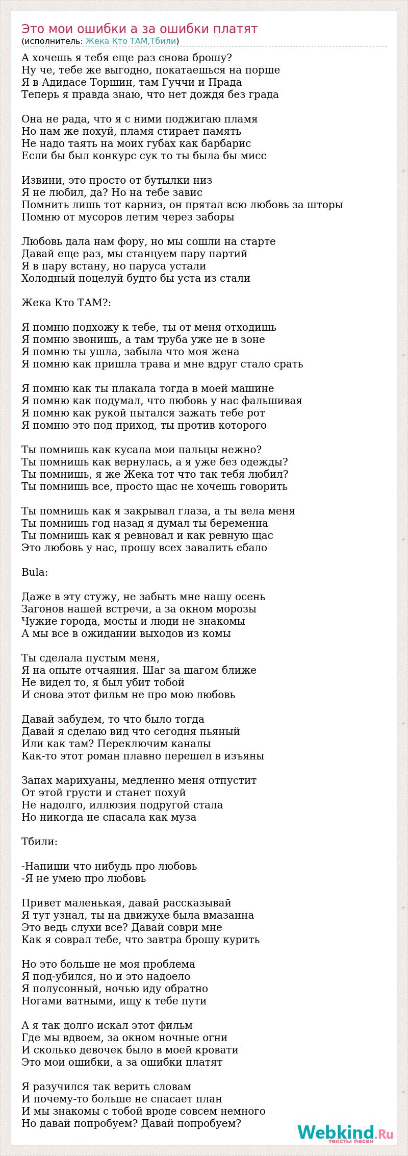 А хочешь я тебя еще раз снова брошу? Ну че, тебе же выгодно, покатаешься на порше Я в Адидасе Торшин, там Гуччи и Прада Теперь я правда знаю, что нет дождя без града Она не рада, что я с ними поджигаю пламя Но нам же похуй, пламя стирает память Не надо таять на моих губах как барбарис Если бы был конкурс сук то ты была бы мисс Извини, это просто от бутылки низ Я не любил, да? Но на тебе завис Помнить лишь тот карниз, он прятал всю любовь за шторы Помню от мусоров летим через заборы Любовь дала нам фору, но мы сошли на старте Давай еще раз, мы станцуем пару партий Я в пару встану, но паруса устали Холодный поцелуй будто бы уста из стали Жека Кто ТАМ?: Я помню подхожу к тебе, ты от меня отходишь Я помню звонишь, а там труба уже не в зоне Я помню ты ушла, забыла что моя жена Я помню как пришла трава и мне вдруг стало срать Я помню как ты плакала тогда в моей машине Я помню как подумал, что любовь у нас фальшивая Я помню как рукой пытался зажать тебе рот Я помню это под приход, ты против которого Ты помнишь как кусала мои пальцы нежно? Ты помнишь как вернулась, а я уже без одежды? Ты помнишь, я же Жека тот что так тебя любил? Ты помнишь все, просто щас не хочешь говорить Ты помнишь как я закрывал глаза, а ты вела меня Ты помнишь год назад я думал ты беременна Ты помнишь как я ревновал и как ревную щас Это любовь у нас, прошу всех завалить ебало Bula: Даже в эту стужу, не забыть мне нашу осень Загонов нашей встречи, а за окном морозы Чужие города, мосты и люди не знакомы А мы все в ожидании выходов из комы Ты сделала пустым меня, Я на опыте отчаяния. Шаг за шагом ближе Не видел то, я был убит тобой И снова этот фильм не про мою любовь Давай забудем, то что было тогда Давай я сделаю вид что сегодня пьяный Или как там? Переключим каналы Как-то этот роман плавно перешел в изъяны Запах марихуаны, медленно меня отпустит От этой грусти и станет похуй Не надолго, иллюзия подругой стала Но никогда не спасала как муза Тбили: -Напиши что нибудь про любовь -Я не умею про любовь Привет маленькая, давай рассказывай Я тут узнал, ты на движухе была вмазанна Это ведь слухи все? Давай соври мне Как я соврал тебе, что завтра брошу курить Но это больше не моя проблема Я под-убился, но и это надоело Я полусонный, ночью иду обратно Ногами ватными, ищу к тебе пути А я так долго искал этот фильм Где мы вдвоем, за окном ночные огни И сколько девочек было в моей кровати Это мои ошибки, а за ошибки платят Я разучился так верить словам И почему-то больше не спасает план И мы знакомы с тобой вроде совсем немного Но давай попробуем? Давай попробуем?