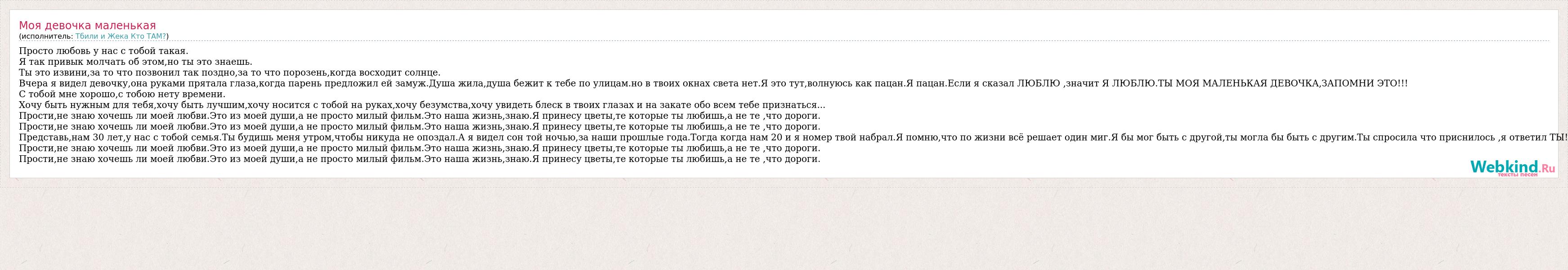 Просто любовь у нас с тобой такая. Я так привык молчать об этом,но ты это знаешь. Ты это извини,за то что позвонил так поздно,за то что порозень,когда восходит солнце. Вчера я видел девочку,она руками прятала глаза,когда парень предложил ей замуж.Душа жила,душа бежит к тебе по улицам.но в твоих окнах света нет.Я это тут,волнуюсь как пацан.Я пацан.Если я сказал ЛЮБЛЮ ,значит Я ЛЮБЛЮ.ТЫ МОЯ МАЛЕНЬКАЯ ДЕВОЧКА,ЗАПОМНИ ЭТО!!! С тобой мне хорошо,с тобою нету времени. Хочу быть нужным для тебя,хочу быть лучшим,хочу носится с тобой на руках,хочу безумства,хочу увидеть блеск в твоих глазах и на закате обо всем тебе признаться... Прости,не знаю хочешь ли моей любви.Это из моей души,а не просто милый фильм.Это наша жизнь,знаю.Я принесу цветы,те которые ты любишь,а не те ,что дороги. Прости,не знаю хочешь ли моей любви.Это из моей души,а не просто милый фильм.Это наша жизнь,знаю.Я принесу цветы,те которые ты любишь,а не те ,что дороги. Представь,нам 30 лет,у нас с тобой семья.Ты будишь меня утром,чтобы никуда не опоздал.А я видел сон той ночью,за наши прошлые года.Тогда когда нам 20 и я номер твой набрал.Я помню,что по жизни всё решает один миг.Я бы мог быть с другой,ты могла бы быть с другим.Ты спросила что приснилось ,я ответил ТЫ! Прости,не знаю хочешь ли моей любви.Это из моей души,а не просто милый фильм.Это наша жизнь,знаю.Я принесу цветы,те которые ты любишь,а не те ,что дороги. Прости,не знаю хочешь ли моей любви.Это из моей души,а не просто милый фильм.Это наша жизнь,знаю.Я принесу цветы,те которые ты любишь,а не те ,что дороги.