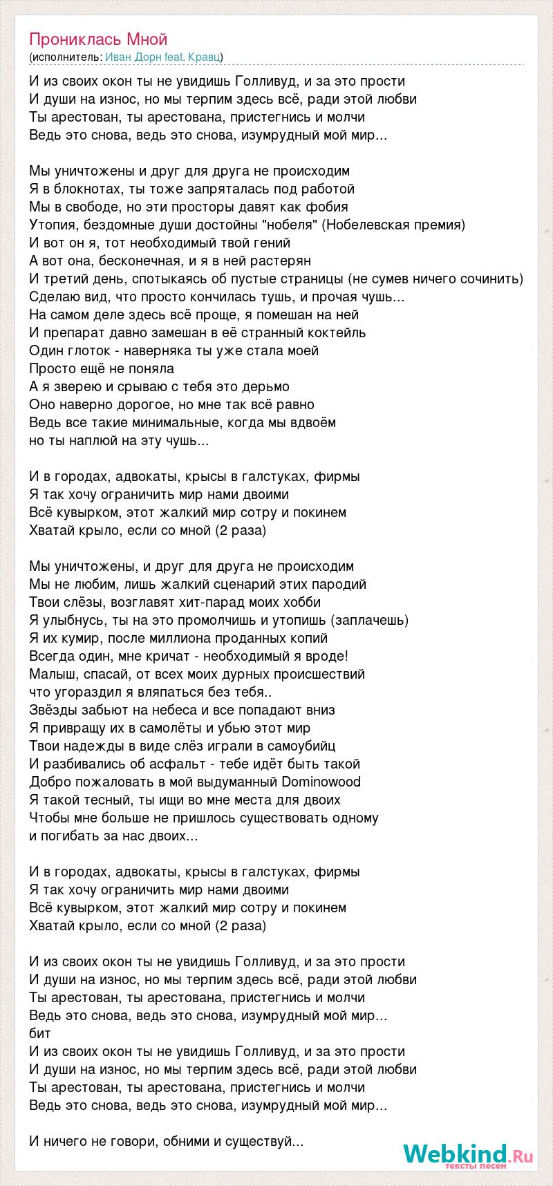 И из своих окон ты не увидишь Голливуд, и за это прости И души на износ, но мы терпим здесь всё, ради этой любви Ты арестован, ты арестована, пристегнись и молчи Ведь это снова, ведь это снова, изумрудный мой мир... Мы уничтожены и друг для друга не происходим Я в блокнотах, ты тоже запряталась под работой Мы в свободе, но эти просторы давят как фобия Утопия, бездомные души достойны "нобеля" (Нобелевская премия) И вот он я, тот необходимый твой гений А вот она, бесконечная, и я в ней растерян И третий день, спотыкаясь об пустые страницы (не сумев ничего сочинить) Сделаю вид, что просто кончилась тушь, и прочая чушь... На самом деле здесь всё проще, я помешан на ней И препарат давно замешан в её странный коктейль Один глоток - наверняка ты уже стала моей Просто ещё не поняла А я зверею и срываю с тебя это дерьмо Оно наверно дорогое, но мне так всё равно Ведь все такие минимальные, когда мы вдвоём но ты наплюй на эту чушь... И в городах, адвокаты, крысы в галстуках, фирмы Я так хочу ограничить мир нами двоими Всё кувырком, этот жалкий мир сотру и покинем Хватай крыло, если со мной (2 раза) Мы уничтожены, и друг для друга не происходим Мы не любим, лишь жалкий сценарий этих пародий Твои слёзы, возглавят хит-парад моих хобби Я улыбнусь, ты на это промолчишь и утопишь (заплачешь) Я их кумир, после миллиона проданных копий Всегда один, мне кричат - необходимый я вроде! Малыш, спасай, от всех моих дурных происшествий что угораздил я вляпаться без тебя.. Звёзды забьют на небеса и все попадают вниз Я привращу их в самолёты и убью этот мир Твои надежды в виде слёз играли в самоубийц И разбивались об асфальт - тебе идёт быть такой Добро пожаловать в мой выдуманный Dominowood Я такой тесный, ты ищи во мне места для двоих Чтобы мне больше не пришлось существовать одному и погибать за нас двоих... И в городах, адвокаты, крысы в галстуках, фирмы Я так хочу ограничить мир нами двоими Всё кувырком, этот жалкий мир сотру и покинем Хватай крыло, если со мной (2 раза) И из своих окон ты не увидишь Голливуд, и за это прости И души на износ, но мы терпим здесь всё, ради этой любви Ты арестован, ты арестована, пристегнись и молчи Ведь это снова, ведь это снова, изумрудный мой мир... бит И из своих окон ты не увидишь Голливуд, и за это прости И души на износ, но мы терпим здесь всё, ради этой любви Ты арестован, ты арестована, пристегнись и молчи Ведь это снова, ведь это снова, изумрудный мой мир... И ничего не говори, обними и существуй...