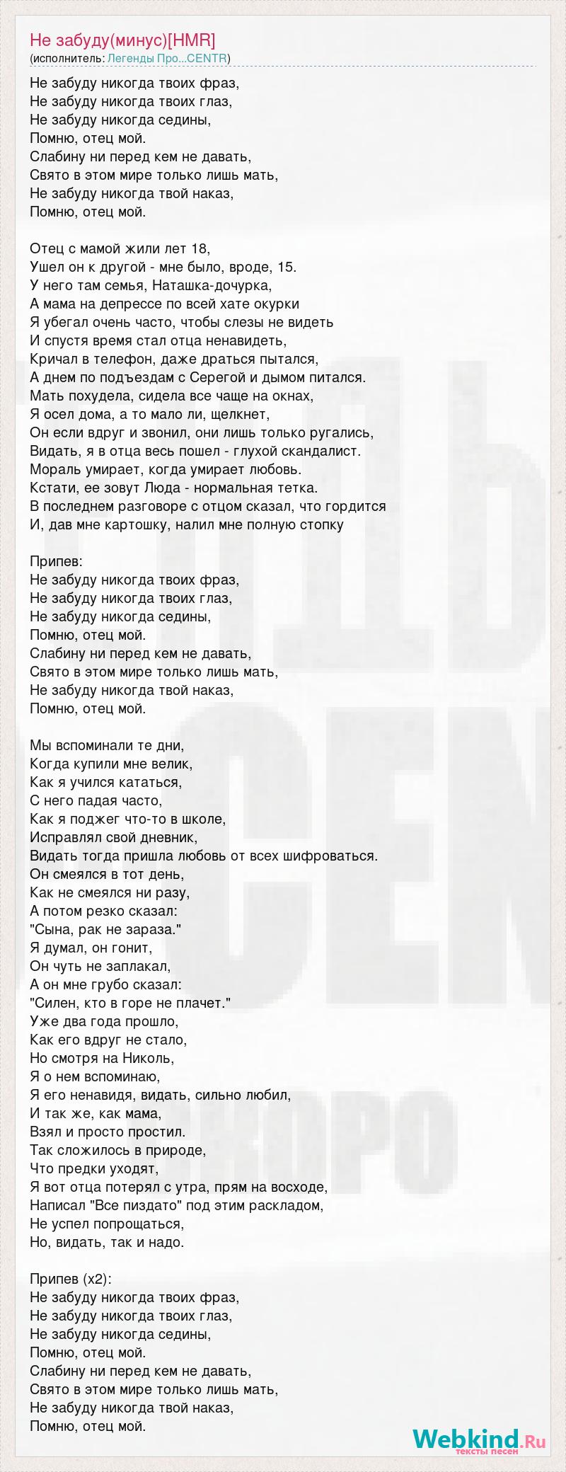 Не забуду никогда твоих фраз, Не забуду никогда твоих глаз, Не забуду никогда седины, Помню, отец мой. Слабину ни перед кем не давать, Свято в этом мире только лишь мать, Не забуду никогда твой наказ, Помню, отец мой. Отец с мамой жили лет 18, Ушел он к другой - мне было, вроде, 15. У него там семья, Наташка-дочурка, А мама на депрессе по всей хате окурки Я убегал очень часто, чтобы слезы не видеть И спустя время стал отца ненавидеть, Кричал в телефон, даже драться пытался, А днем по подъездам с Серегой и дымом питался. Мать похудела, сидела все чаще на окнах, Я осел дома, а то мало ли, щелкнет, Он если вдруг и звонил, они лишь только ругались, Видать, я в отца весь пошел - глухой скандалист. Мораль умирает, когда умирает любовь. Кстати, ее зовут Люда - нормальная тетка. В последнем разговоре с отцом сказал, что гордится И, дав мне картошку, налил мне полную стопку Припев: Не забуду никогда твоих фраз, Не забуду никогда твоих глаз, Не забуду никогда седины, Помню, отец мой. Слабину ни перед кем не давать, Свято в этом мире только лишь мать, Не забуду никогда твой наказ, Помню, отец мой. Мы вспоминали те дни, Когда купили мне велик, Как я учился кататься, С него падая часто, Как я поджег что-то в школе, Исправлял свой дневник, Видать тогда пришла любовь от всех шифроваться. Он смеялся в тот день, Как не смеялся ни разу, А потом резко сказал: "Сына, рак не зараза." Я думал, он гонит, Он чуть не заплакал, А он мне грубо сказал: "Силен, кто в горе не плачет." Уже два года прошло, Как его вдруг не стало, Но смотря на Николь, Я о нем вспоминаю, Я его ненавидя, видать, сильно любил, И так же, как мама, Взял и просто простил. Так сложилось в природе, Что предки уходят, Я вот отца потерял с утра, прям на восходе, Написал "Все пиздато" под этим раскладом, Не успел попрощаться, Но, видать, так и надо. Припев (х2): Не забуду никогда твоих фраз, Не забуду никогда твоих глаз, Не забуду никогда седины, Помню, отец мой. Слабину ни перед кем не давать, Свято в этом мире только лишь мать, Не забуду никогда твой наказ, Помню, отец мой.