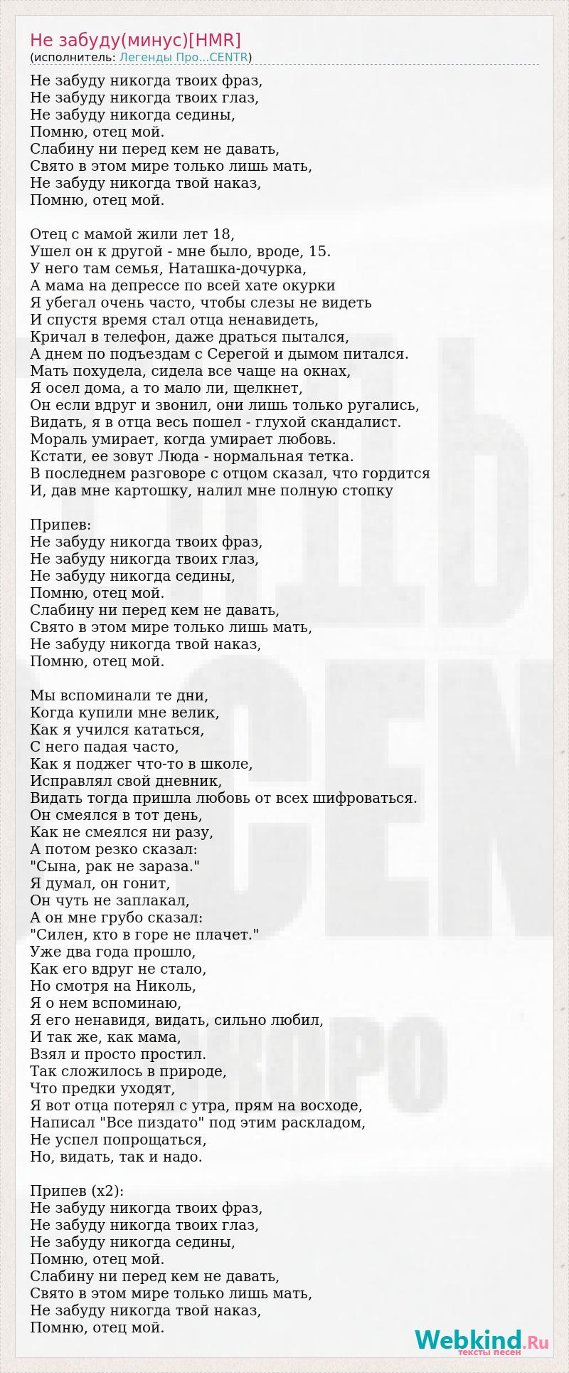 Не забуду никогда твоих фраз, Не забуду никогда твоих глаз, Не забуду никогда седины, Помню, отец мой. Слабину ни перед кем не давать, Свято в этом мире только лишь мать, Не забуду никогда твой наказ, Помню, отец мой. Отец с мамой жили лет 18, Ушел он к другой - мне было, вроде, 15. У него там семья, Наташка-дочурка, А мама на депрессе по всей хате окурки Я убегал очень часто, чтобы слезы не видеть И спустя время стал отца ненавидеть, Кричал в телефон, даже драться пытался, А днем по подъездам с Серегой и дымом питался. Мать похудела, сидела все чаще на окнах, Я осел дома, а то мало ли, щелкнет, Он если вдруг и звонил, они лишь только ругались, Видать, я в отца весь пошел - глухой скандалист. Мораль умирает, когда умирает любовь. Кстати, ее зовут Люда - нормальная тетка. В последнем разговоре с отцом сказал, что гордится И, дав мне картошку, налил мне полную стопку Припев: Не забуду никогда твоих фраз, Не забуду никогда твоих глаз, Не забуду никогда седины, Помню, отец мой. Слабину ни перед кем не давать, Свято в этом мире только лишь мать, Не забуду никогда твой наказ, Помню, отец мой. Мы вспоминали те дни, Когда купили мне велик, Как я учился кататься, С него падая часто, Как я поджег что-то в школе, Исправлял свой дневник, Видать тогда пришла любовь от всех шифроваться. Он смеялся в тот день, Как не смеялся ни разу, А потом резко сказал: "Сына, рак не зараза." Я думал, он гонит, Он чуть не заплакал, А он мне грубо сказал: "Силен, кто в горе не плачет." Уже два года прошло, Как его вдруг не стало, Но смотря на Николь, Я о нем вспоминаю, Я его ненавидя, видать, сильно любил, И так же, как мама, Взял и просто простил. Так сложилось в природе, Что предки уходят, Я вот отца потерял с утра, прям на восходе, Написал "Все пиздато" под этим раскладом, Не успел попрощаться, Но, видать, так и надо. Припев (х2): Не забуду никогда твоих фраз, Не забуду никогда твоих глаз, Не забуду никогда седины, Помню, отец мой. Слабину ни перед кем не давать, Свято в этом мире только лишь мать, Не забуду никогда твой наказ, Помню, отец мой.