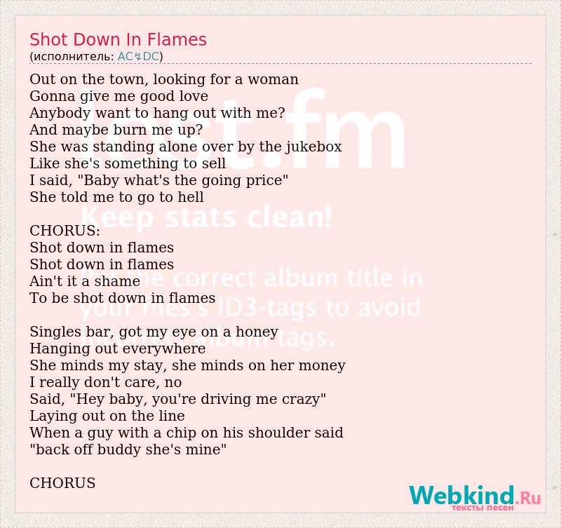 Out on the town, looking for a woman Gonna give me good love Anybody want to hang out with me? And maybe burn me up? She was standing alone over by the jukebox Like she's something to sell I said, "Baby what's the going price" She told me to go to hell CHORUS: Shot down in flames Shot down in flames Ain't it a shame To be shot down in flames Singles bar, got my eye on a honey Hanging out everywhere She minds my stay, she minds on her money I really don't care, no Said, "Hey baby, you're driving me crazy" Laying out on the line When a guy with a chip on his shoulder said "back off buddy she's mine" CHORUS