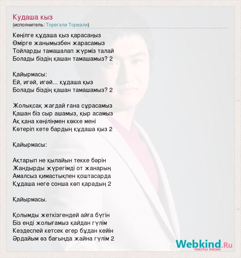 Көңілге құдаша қыз қарасаңыз Өмірге жанымызбен жарасамыз Тойларды тамашалап жүрміз талай Болады біздің қашан тамашамыз? 2 Қайырмасы: Ей, игәй, игәй... құдаша қыз Болады біздің қашан тамашамыз? 2 Жолықсақ жағдай ғана сұрасамыз Қашан біз сыр ашамыз, қыр асамыз Ақ қана көңіліңмен көкке мені Көтеріп кете бардың құдаша қыз 2 Қайырмасы: Ақтарып не қылайын текке бәрін Жандырды жүрегімді от жанарың Амалсыз қимастықпен қоштасарда Құдаша неге сонша көп қарадың 2 Қайырмасы. Қолымды жеткізгендей айға бүгін Біз енді жолығамыз қайдан гүлім Кездеспей кетсек егер бұдан кейін Әрдайым өз бағыңда жайна гүлім 2