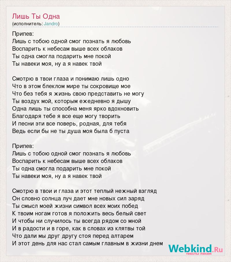 Припев: Лишь с тобою одной смог познать я любовь Воспарить к небесам выше всех облаков Ты одна смогла подарить мне покой Ты навеки моя, ну а я навек твой Смотрю в твои глаза и понимаю лишь одно Что в этом блеклом мире ты сокровище мое Что без тебя я жизнь свою представить не могу Ты воздух мой, которым ежедневно я дышу Одна лишь ты способна меня ярко вдохновить Благодаря тебе я все еще могу творить И песни эти все поверь, родная, для тебя Ведь если бы не ты душа моя была б пуста Припев: Лишь с тобою одной смог познать я любовь Воспарить к небесам выше всех облаков Ты одна смогла подарить мне покой Ты навеки моя, ну а я навек твой Смотрю в твои и глаза и этот теплый нежный взгляд Он словно солнца луч дает мне новых сил заряд Ты смысл моей жизни символ всех моих побед К твоим ногам готов я положить весь белый свет И чтобы ни случилось ты всегда рядом со мной И в радости и в горе, как в словах из клятвы той Что дали мы друг другу стоя перед алтарем И этот день для нас стал самым главным в жизни днем