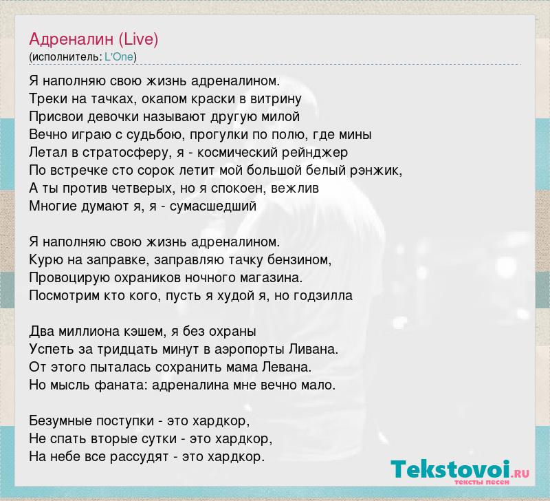 Я наполняю свою жизнь адреналином. Треки на тачках, окапом краски в витрину Присвои девочки называют другую милой Вечно играю с судьбою, прогулки по полю, где мины Летал в стратосферу, я - космический рейнджер По встречке сто сорок летит мой большой белый рэнжик, А ты против четверых, но я спокоен, вежлив Многие думают я, я - сумасшедший Я наполняю свою жизнь адреналином. Курю на заправке, заправляю тачку бензином, Провоцирую охраников ночного магазина. Посмотрим кто кого, пусть я худой я, но годзилла Два миллиона кэшем, я без охраны Успеть за тридцать минут в аэропорты Ливана. От этого пыталась сохранить мама Левана. Но мысль фаната: адреналина мне вечно мало. Безумные поступки - это хардкор, Не спать вторые сутки - это хардкор, На небе все рассудят - это хардкор.