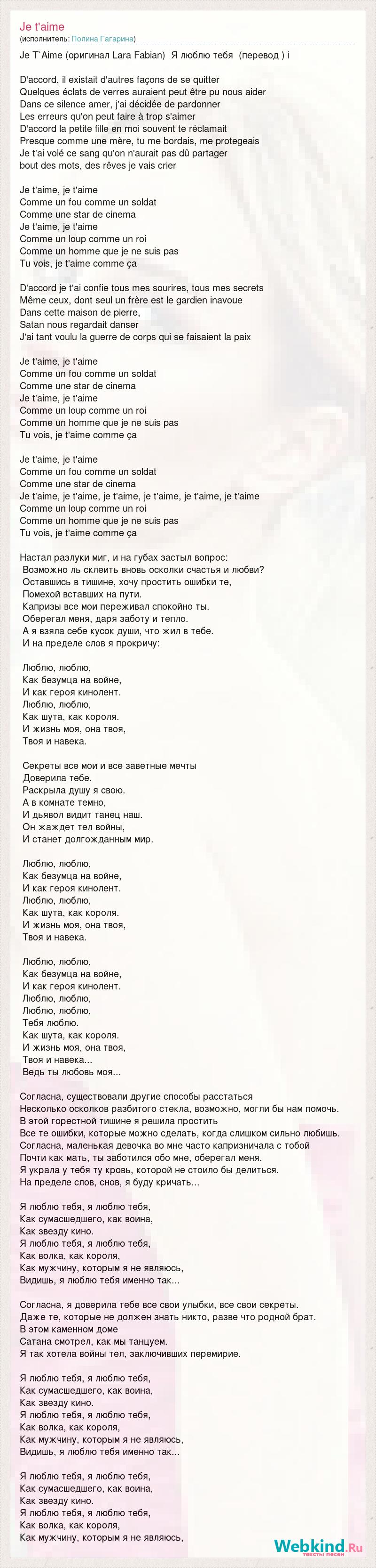 Je T`Aime (оригинал Lara Fabian) Я люблю тебя (перевод ) i D'accord, il existait d'autres façons de se quitter Quelques éclats de verres auraient peut être pu nous aider Dans ce silence amer, j'ai décidée de pardonner Les erreurs qu'on peut faire à trop s'aimer D'accord la petite fille en moi souvent te réclamait Presque comme une mère, tu me bordais, me protegeais Je t'ai volé ce sang qu'on n'aurait pas dû partager bout des mots, des rêves je vais crier Je t'aime, je t'aime Comme un fou comme un soldat Comme une star de cinema Je t'aime, je t'aime Comme un loup comme un roi Comme un homme que je ne suis pas Tu vois, je t'aime comme ça D'accord je t'ai confie tous mes sourires, tous mes secrets Même ceux, dont seul un frère est le gardien inavoue Dans cette maison de pierre, Satan nous regardait danser J'ai tant voulu la guerre de corps qui se faisaient la paix Je t'aime, je t'aime Comme un fou comme un soldat Comme une star de cinema Je t'aime, je t'aime Comme un loup comme un roi Comme un homme que je ne suis pas Tu vois, je t'aime comme ça Je t'aime, je t'aime Comme un fou comme un soldat Comme une star de cinema Je t'aime, je t'aime, je t'aime, je t'aime, je t'aime, je t'aime Comme un loup comme un roi Comme un homme que je ne suis pas Tu vois, je t'aime comme ça Настал разлуки миг, и на губах застыл вопрос: Возможно ль склеить вновь осколки счастья и любви? Оставшись в тишине, хочу простить ошибки те, Помехой вставших на пути. Капризы все мои переживал спокойно ты. Оберегал меня, даря заботу и тепло. А я взяла себе кусок души, что жил в тебе. И на пределе слов я прокричу: Люблю, люблю, Как безумца на войне, И как героя кинолент. Люблю, люблю, Как шута, как короля. И жизнь моя, она твоя, Твоя и навека. Секреты все мои и все заветные мечты Доверила тебе. Раскрыла душу я свою. А в комнате темно, И дьявол видит танец наш. Он жаждет тел войны, И станет долгожданным мир. Люблю, люблю, Как безумца на войне, И как героя кинолент. Люблю, люблю, Как шута, как короля. И жизнь моя, она твоя, Твоя и навека. Люблю, люблю, Как безумца на войне, И как героя кинолент. Люблю, люблю, Люблю, люблю, Тебя люблю. Как шута, как короля. И жизнь моя, она твоя, Твоя и навека... Ведь ты любовь моя... Согласна, существовали другие способы расстаться Несколько осколков разбитого стекла, возможно, могли бы нам помочь. В этой горестной тишине я решила простить Все те ошибки, которые можно сделать, когда слишком сильно любишь. Согласна, маленькая девочка во мне часто капризничала с тобой Почти как мать, ты заботился обо мне, оберегал меня. Я украла у тебя ту кровь, которой не стоило бы делиться. На пределе слов, снов, я буду кричать... Я люблю тебя, я люблю тебя, Как сумасшедшего, как воина, Как звезду кино. Я люблю тебя, я люблю тебя, Как волка, как короля, Как мужчину, которым я не являюсь, Видишь, я люблю тебя именно так... Согласна, я доверила тебе все свои улыбки, все свои секреты. Даже те, которые не должен знать никто, разве что родной брат. В этом каменном доме Сатана смотрел, как мы танцуем. Я так хотела войны тел, заключивших перемирие. Я люблю тебя, я люблю тебя, Как сумасшедшего, как воина, Как звезду кино. Я люблю тебя, я люблю тебя, Как волка, как короля, Как мужчину, которым я не являюсь, Видишь, я люблю тебя именно так... Я люблю тебя, я люблю тебя, Как сумасшедшего, как воина, Как звезду кино. Я люблю тебя, я люблю тебя, Как волка, как короля, Как мужчину, которым я не являюсь,