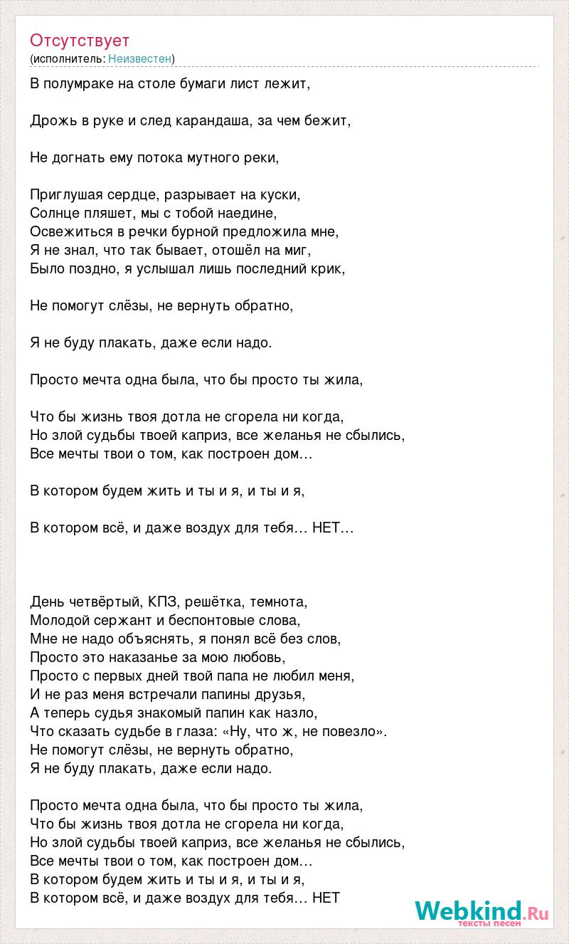 В полумраке на столе бумаги лист лежит, Дрожь в руке и след карандаша, за чем бежит, Не догнать ему потока мутного реки, Приглушая сердце, разрывает на куски, Солнце пляшет, мы с тобой наедине, Освежиться в речки бурной предложила мне, Я не знал, что так бывает, отошёл на миг, Было поздно, я услышал лишь последний крик, Не помогут слёзы, не вернуть обратно, Я не буду плакать, даже если надо. Просто мечта одна была, что бы просто ты жила, Что бы жизнь твоя дотла не сгорела ни когда, Но злой судьбы твоей каприз, все желанья не сбылись, Все мечты твои о том, как построен дом… В котором будем жить и ты и я, и ты и я, В котором всё, и даже воздух для тебя… НЕТ… День четвёртый, КПЗ, решётка, темнота, Молодой сержант и беспонтовые слова, Мне не надо объяснять, я понял всё без слов, Просто это наказанье за мою любовь, Просто с первых дней твой папа не любил меня, И не раз меня встречали папины друзья, А теперь судья знакомый папин как назло, Что сказать судьбе в глаза: «Ну, что ж, не повезло». Не помогут слёзы, не вернуть обратно, Я не буду плакать, даже если надо. Просто мечта одна была, что бы просто ты жила, Что бы жизнь твоя дотла не сгорела ни когда, Но злой судьбы твоей каприз, все желанья не сбылись, Все мечты твои о том, как построен дом… В котором будем жить и ты и я, и ты и я, В котором всё, и даже воздух для тебя… НЕТ