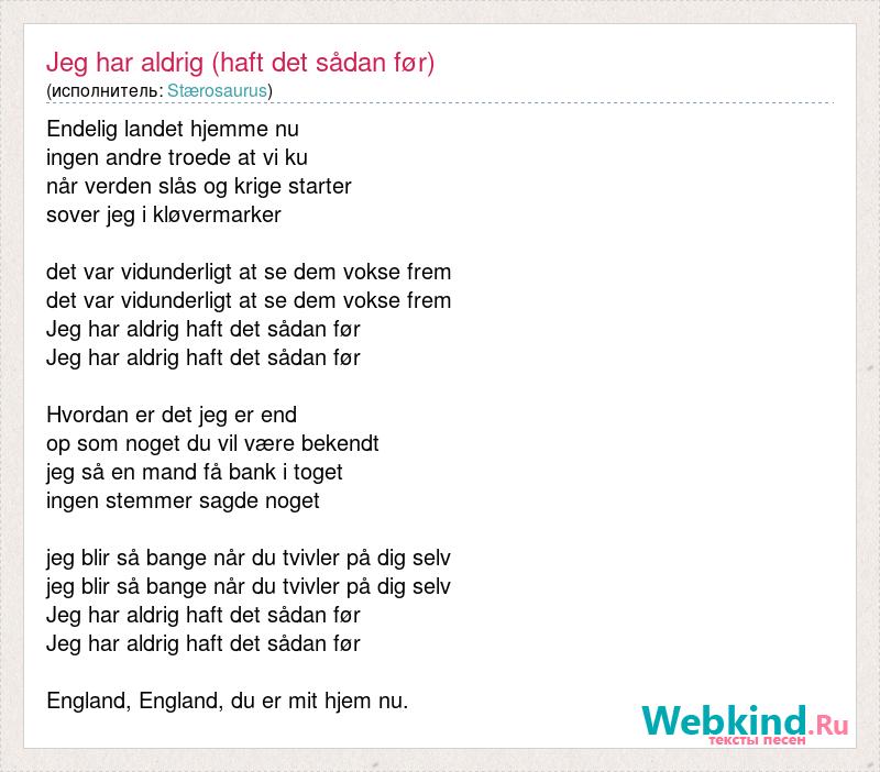 Endelig landet hjemme nu ingen andre troede at vi ku når verden slås og krige starter sover jeg i kløvermarker det var vidunderligt at se dem vokse frem det var vidunderligt at se dem vokse frem Jeg har aldrig haft det sådan før Jeg har aldrig haft det sådan før Hvordan er det jeg er end op som noget du vil være bekendt jeg så en mand få bank i toget ingen stemmer sagde noget jeg blir så bange når du tvivler på dig selv jeg blir så bange når du tvivler på dig selv Jeg har aldrig haft det sådan før Jeg har aldrig haft det sådan før England, England, du er mit hjem nu.