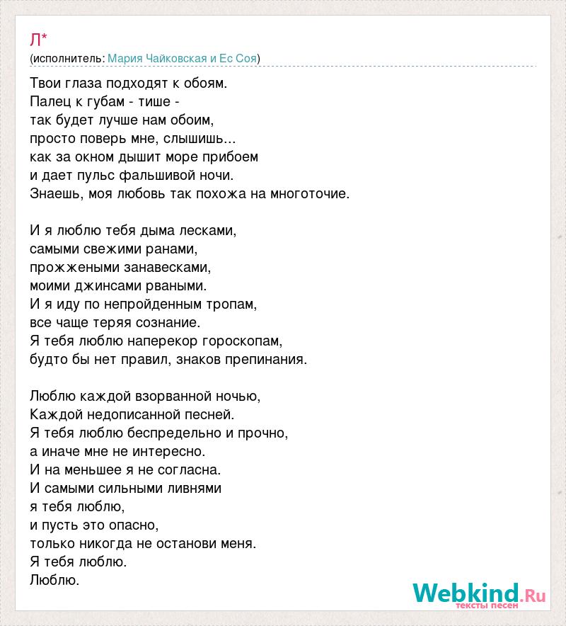 Твои глаза подходят к обоям. Палец к губам - тише - так будет лучше нам обоим, просто поверь мне, слышишь... как за окном дышит море прибоем и дает пульс фальшивой ночи. Знаешь, моя любовь так похожа на многоточие. И я люблю тебя дыма лесками, самыми свежими ранами, прожжеными занавесками, моими джинсами рваными. И я иду по непройденным тропам, все чаще теряя сознание. Я тебя люблю наперекор гороскопам, будто бы нет правил, знаков препинания. Люблю каждой взорванной ночью, Каждой недописанной песней. Я тебя люблю беспредельно и прочно, а иначе мне не интересно. И на меньшее я не согласна. И самыми сильными ливнями я тебя люблю, и пусть это опасно, только никогда не останови меня. Я тебя люблю. Люблю.