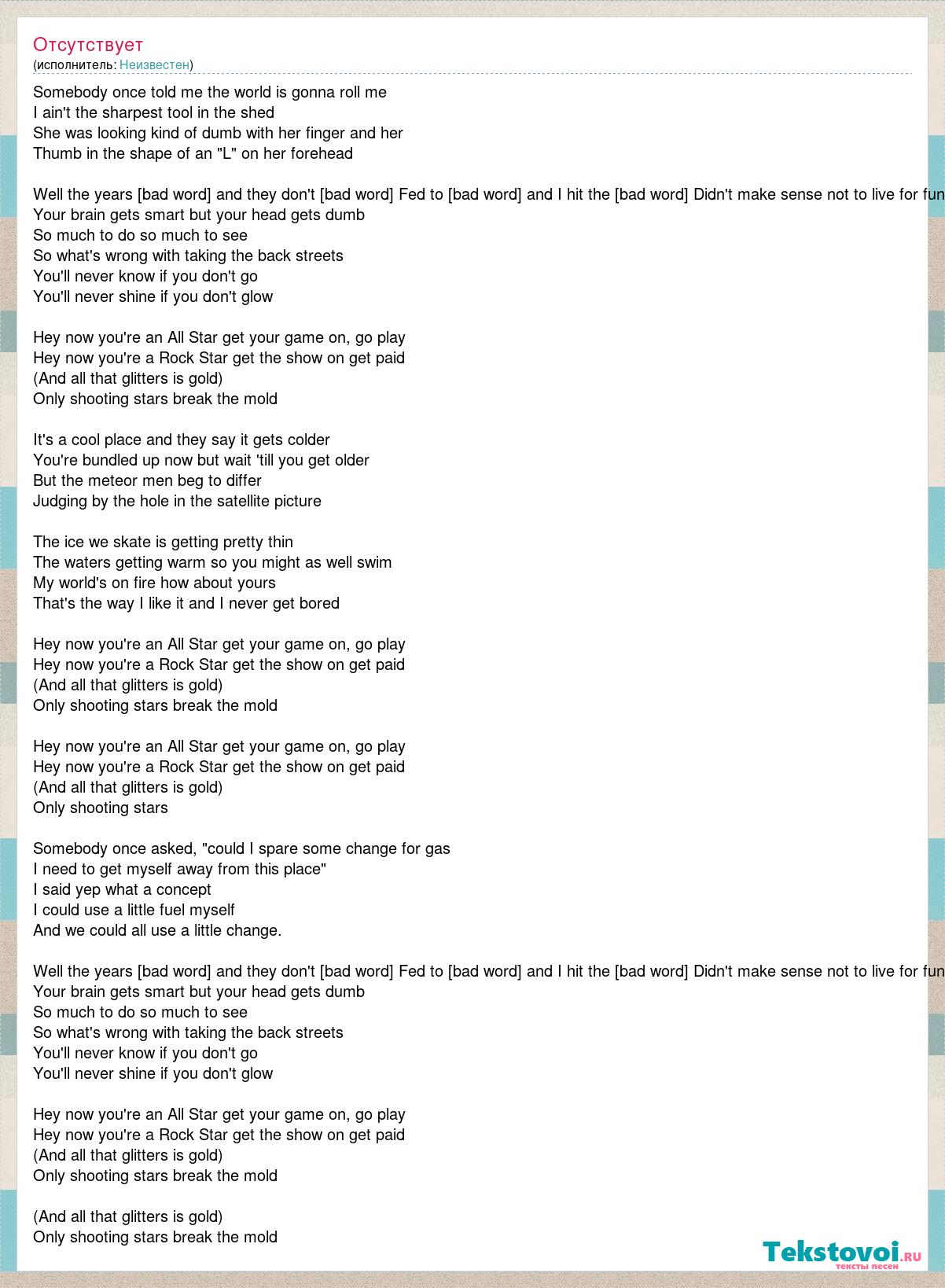 Somebody once told me the world is gonna roll me I ain't the sharpest tool in the shed She was looking kind of dumb with her finger and her Thumb in the shape of an "L" on her forehead Well the years start coming and they don't stop coming Fed to the rules and I hit the ground running Didn't make sense not to live for fun Your brain gets smart but your head gets dumb So much to do so much to see So what's wrong with taking the back streets You'll never know if you don't go You'll never shine if you don't glow Hey now you're an All Star get your game on, go play Hey now you're a Rock Star get the show on get paid (And all that glitters is gold) Only shooting stars break the mold It's a cool place and they say it gets colder You're bundled up now but wait 'till you get older But the meteor men beg to differ Judging by the hole in the satellite picture The ice we skate is getting pretty thin The waters getting warm so you might as well swim My world's on fire how about yours That's the way I like it and I never get bored Hey now you're an All Star get your game on, go play Hey now you're a Rock Star get the show on get paid (And all that glitters is gold) Only shooting stars break the mold Hey now you're an All Star get your game on, go play Hey now you're a Rock Star get the show on get paid (And all that glitters is gold) Only shooting stars Somebody once asked, "could I spare some change for gas I need to get myself away from this place" I said yep what a concept I could use a little fuel myself And we could all use a little change. Well the years start coming and they don't stop coming Fed to the rules and I hit the ground running Didn't make sense not to live for fun Your brain gets smart but your head gets dumb So much to do so much to see So what's wrong with taking the back streets You'll never know if you don't go You'll never shine if you don't glow Hey now you're an All Star get your game on, go play Hey now you're a Rock Star get the show on get paid (And all that glitters is gold) Only shooting stars break the mold (And all that glitters is gold) Only shooting stars break the mold