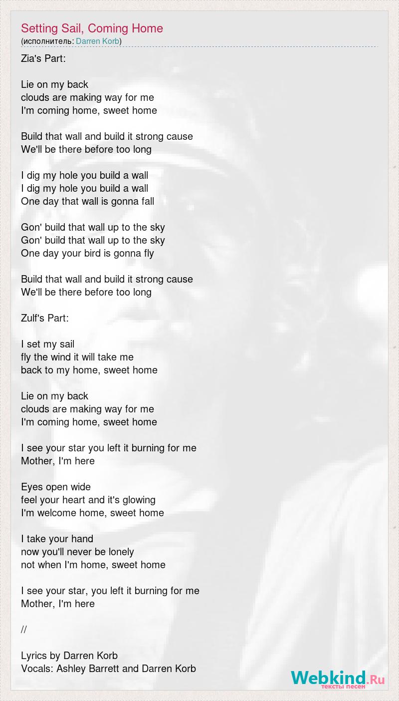 Zia's Part: Lie on my back clouds are making way for me I'm coming home, sweet home Build that wall and build it strong cause We'll be there before too long I dig my hole you build a wall I dig my hole you build a wall One day that wall is gonna fall Gon' build that wall up to the sky Gon' build that wall up to the sky One day your bird is gonna fly Build that wall and build it strong cause We'll be there before too long Zulf's Part: I set my sail fly the wind it will take me back to my home, sweet home Lie on my back clouds are making way for me I'm coming home, sweet home I see your star you left it burning for me Mother, I'm here Eyes open wide feel your heart and it's glowing I'm welcome home, sweet home I take your hand now you'll never be lonely not when I'm home, sweet home I see your star, you left it burning for me Mother, I'm here // Lyrics by Darren Korb Vocals: Ashley Barrett and Darren Korb