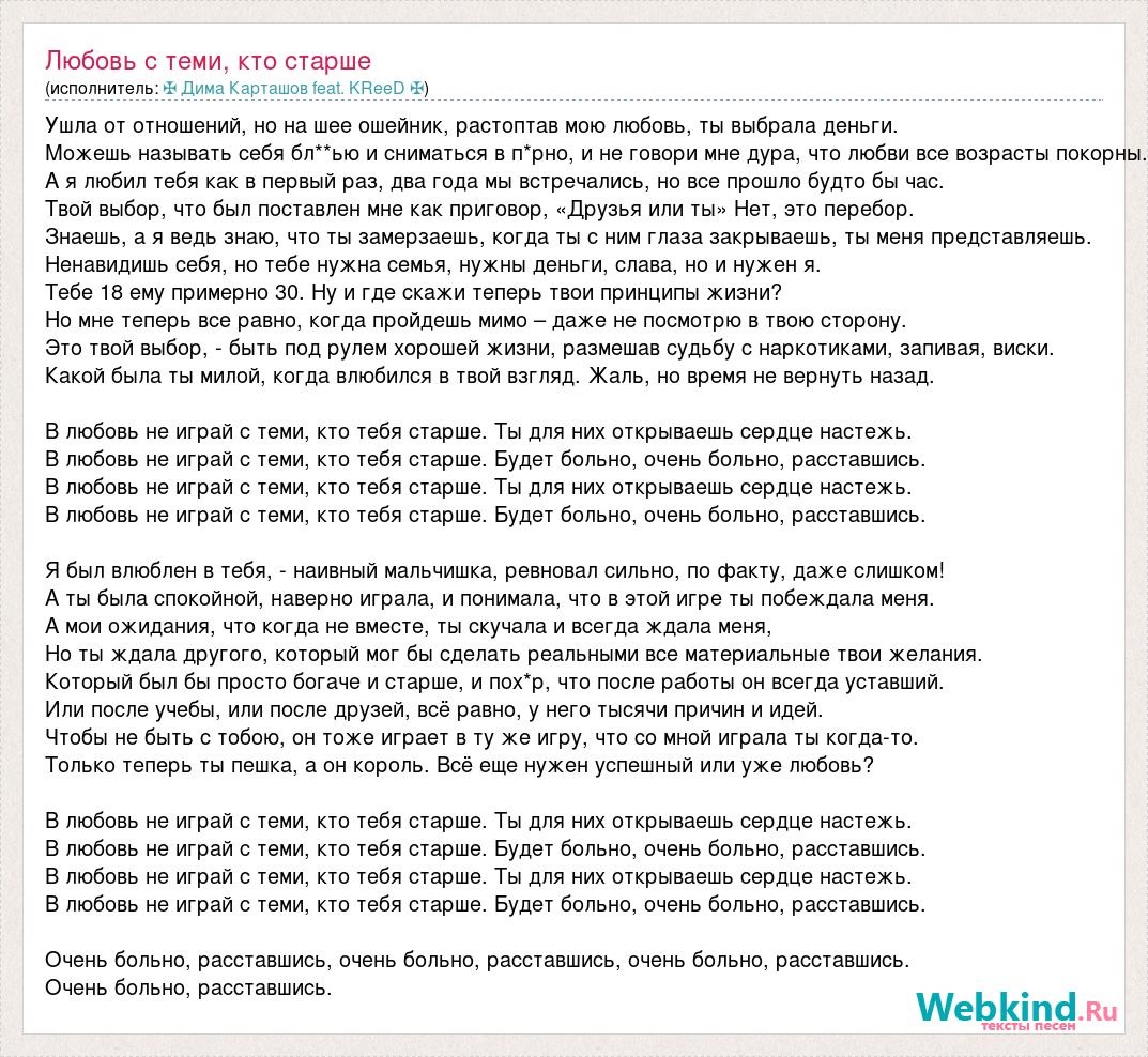 Ушла от отношений, но на шее ошейник, растоптав мою любовь, ты выбрала деньги. Можешь называть себя бл**ью и сниматься в п*рно, и не говори мне дура, что любви все возрасты покорны. А я любил тебя как в первый раз, два года мы встречались, но все прошло будто бы час. Твой выбор, что был поставлен мне как приговор, «Друзья или ты» Нет, это перебор. Знаешь, а я ведь знаю, что ты замерзаешь, когда ты с ним глаза закрываешь, ты меня представляешь. Ненавидишь себя, но тебе нужна семья, нужны деньги, слава, но и нужен я. Тебе 18 ему примерно 30. Ну и где скажи теперь твои принципы жизни? Но мне теперь все равно, когда пройдешь мимо – даже не посмотрю в твою сторону. Это твой выбор, - быть под рулем хорошей жизни, размешав судьбу с наркотиками, запивая, виски. Какой была ты милой, когда влюбился в твой взгляд. Жаль, но время не вернуть назад. В любовь не играй с теми, кто тебя старше. Ты для них открываешь сердце настежь. В любовь не играй с теми, кто тебя старше. Будет больно, очень больно, расставшись. В любовь не играй с теми, кто тебя старше. Ты для них открываешь сердце настежь. В любовь не играй с теми, кто тебя старше. Будет больно, очень больно, расставшись. Я был влюблен в тебя, - наивный мальчишка, ревновал сильно, по факту, даже слишком! А ты была спокойной, наверно играла, и понимала, что в этой игре ты побеждала меня. А мои ожидания, что когда не вместе, ты скучала и всегда ждала меня, Но ты ждала другого, который мог бы сделать реальными все материальные твои желания. Который был бы просто богаче и старше, и пох*р, что после работы он всегда уставший. Или после учебы, или после друзей, всё равно, у него тысячи причин и идей. Чтобы не быть с тобою, он тоже играет в ту же игру, что со мной играла ты когда-то. Только теперь ты пешка, а он король. Всё еще нужен успешный или уже любовь? В любовь не играй с теми, кто тебя старше. Ты для них открываешь сердце настежь. В любовь не играй с теми, кто тебя старше. Будет больно, очень больно, расставшись. В любовь не играй с теми, кто тебя старше. Ты для них открываешь сердце настежь. В любовь не играй с теми, кто тебя старше. Будет больно, очень больно, расставшись. Очень больно, расставшись, очень больно, расставшись, очень больно, расставшись. Очень больно, расставшись.