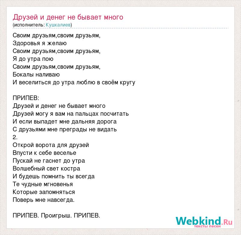 Своим друзьям,своим друзьям, Здоровья я желаю Своим друзьям,своим друзьям, Я до утра пою Своим друзьям,своим друзьям, Бокалы наливаю И веселиться до утра люблю в своём кругу ПРИПЕВ: Друзей и денег не бывает много Друзей могу я вам на пальцах посчитать И если выпадет мне дальняя дорога С друзьями мне преграды не видать 2. Открой ворота для друзей Впусти к себе веселье Пускай не гаснет до утра Волшебный свет костра И будешь помнить ты всегда Те чудные мгновенья Которые запомняться Поверь мне навсегда. ПРИПЕВ. Проигрыш. ПРИПЕВ.